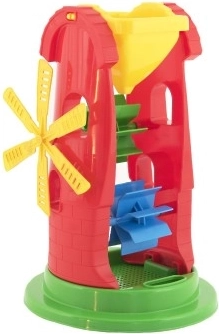 Подкрепете креативността на вашите деца с тази яркоцветна мелничка за пясък и вода. Тази функционална мелничка позволява да се сипва пясък или да се налива вода в горната част и да се наблюдава как колелцата се завъртат, което е огромно забавление за децата.