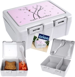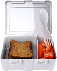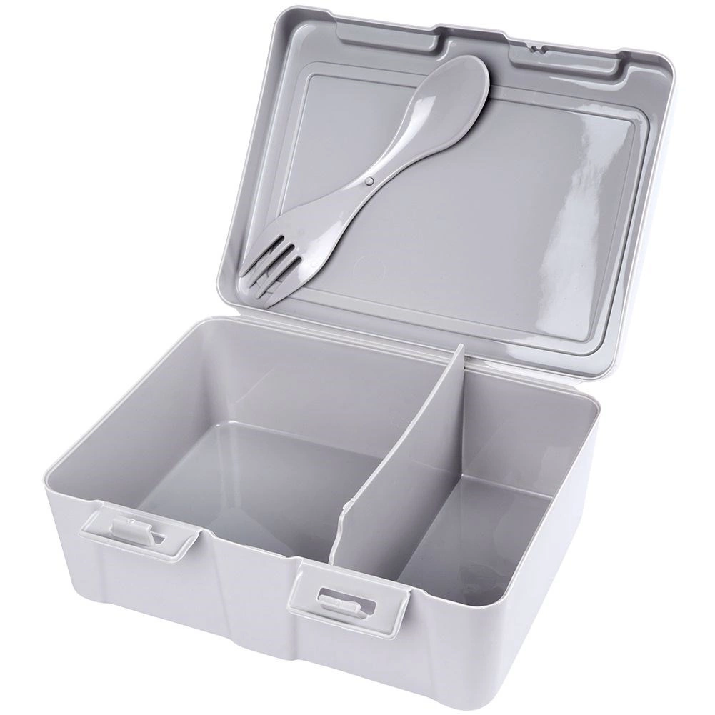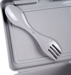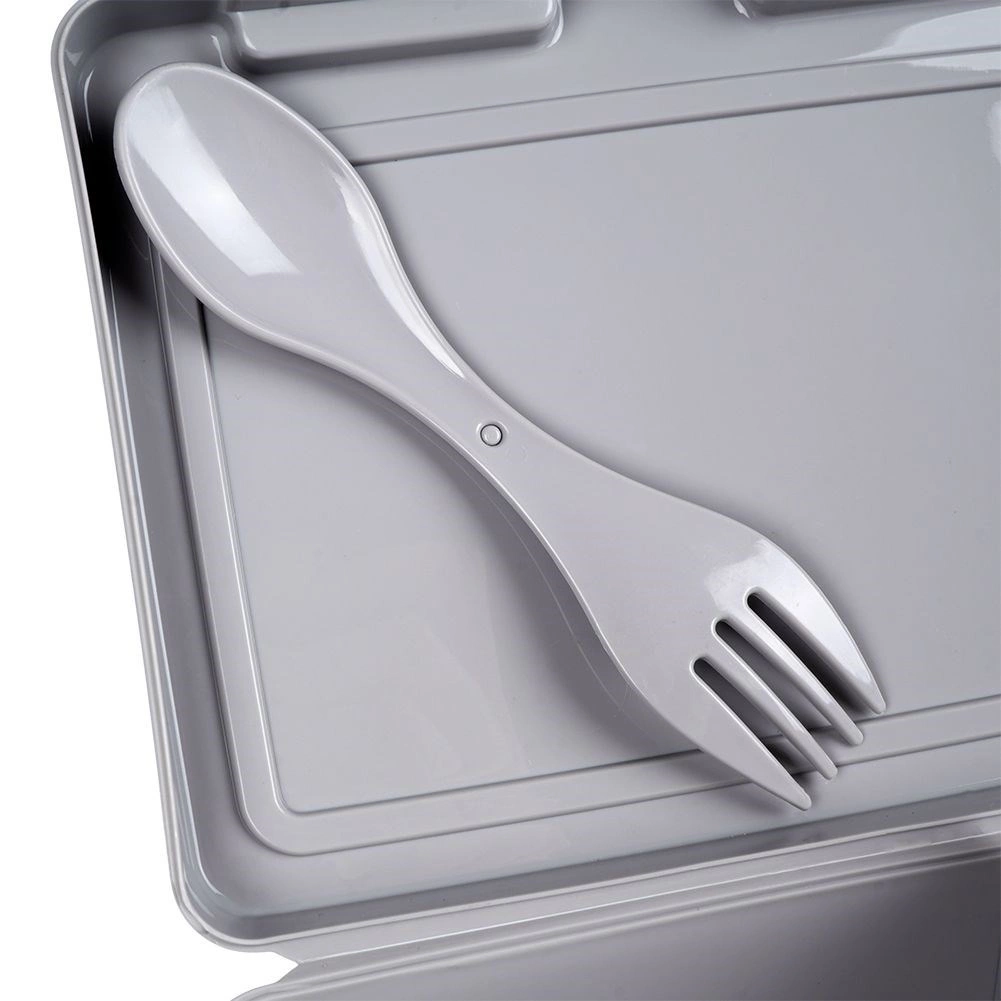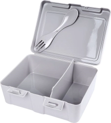 Кутията за закуска с две прегради поддържа храната ви подредено отделена и свежа. Част е умният прибор 2в1 (лъжичка/виличка) с дължина 14,5 cm, който има собствено място под капака, така че винаги е под ръка. Издръжливата изработка, компактните размери и здравите клипове гарантират надеждно затваряне при пренасяне.