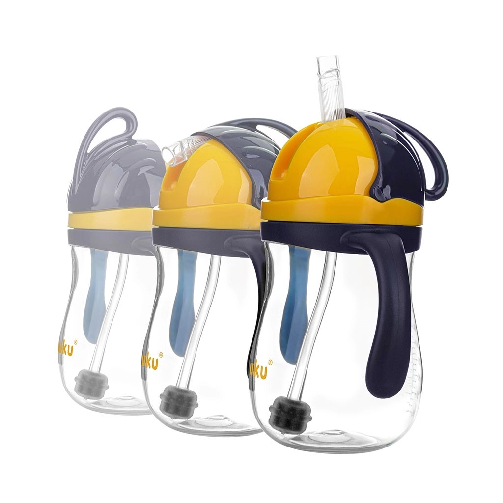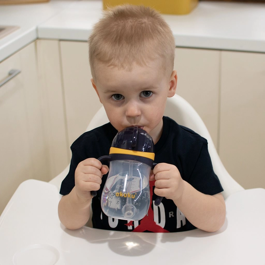 Детската бутилка Akuku със силиконова сламка с тежест е проектирана за самостоятелно пиене без разливане. Тежестта в края на сламката следва нивото на напитката, така че детето може удобно да пие седнало, в количка или дори с обърната бутилка. Flip капакът защитава сламката и предотвратява замърсяване.
