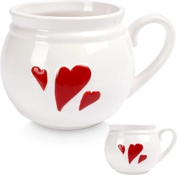 Голяма керамична чаша 800 мл с релефни червени сърчица е идеална за чай, кафе, какао и греяно вино. Има удобна дръжка, лесно се почиства в съдомиялна и е подходяща за микровълнова. Класическата форма „бъчвичка“ ляга чудесно в ръката и украсява всяка маса.