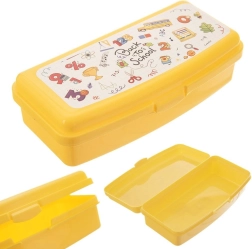 Практична кутия за храна с обем 500 ml в модерно жълт цвят, идеална за канапета, закуски и дребни вещи. Има сигурен закопчаващ капак с един клипс, лека е, лесно се почиства и благодарение на училищния мотив децата я разпознават лесно. Подходяща за училище, екскурзии и пътувания.
