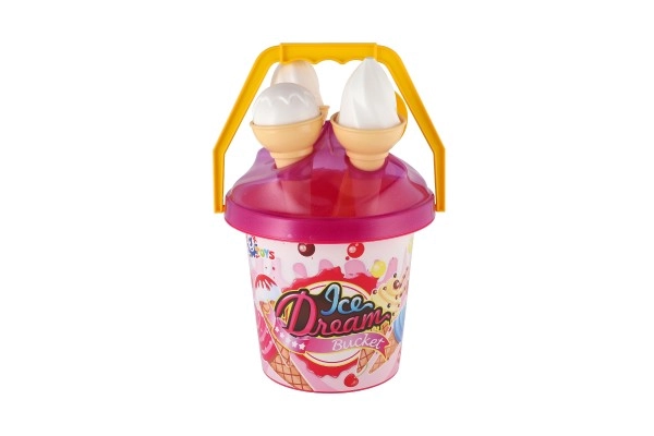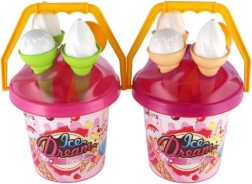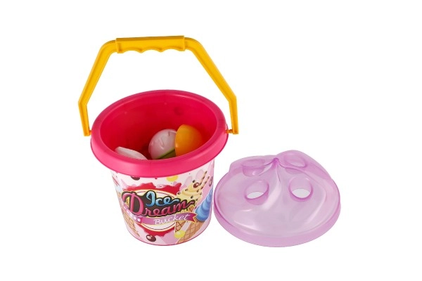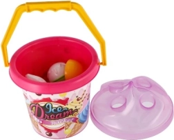 Този цветен комплект за пясък със стилен розов капак и мотив „Ice Dream Bucket“ подпомага фантазията и фината моторика, както и социалните умения при игра на кафене, ресторант или магазин. Капакът има специални отвори за оформяне на топки, така че „сладоледът“ от пясък изглежда като истински.