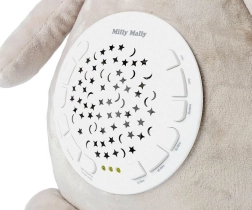 Тази нежна плюшена коала съчетава гушлива играчка и умен нощен проектор. След включване създава по тавана и стените звездно небе и възпроизвежда приспивни песни и бял шум, които успокояват бебето и го отвеждат в страната на сънищата. Благодарение на сваляемия проектор се почиства лесно и се използва точно както ви е нужно.