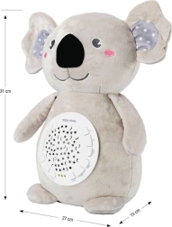 Очарователна плюшена коала със сваляем проектор превръща детската стая в звездно небе и помага на децата да заспят спокойно. Предлага 10 приспивни песни, 5 вида бял шум, 7 цветови режима на светлина, таймер 30/60/90 мин и 5 нива на звука. Меката изработка и безопасните бродирани детайли са идеални за бебета от 0+ месеца.