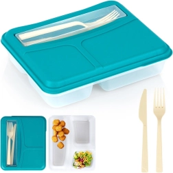 Тази компактна кутия за обяд с разделение на 3 части поддържа основното ястие, салатата и снакса прегледно отделени. Капакът в тюркоазен цвят крие практични прибори – нож и вилица – така че всичко е под ръка, където и да сте. Безопасната изработка без BPA е щадяща за здравето и храната.