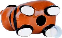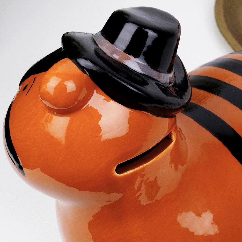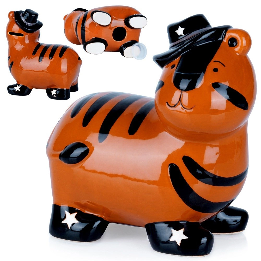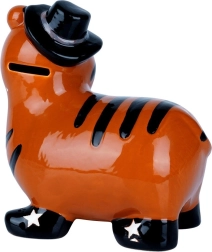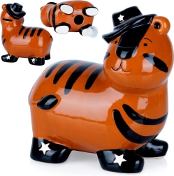 Тази керамична касичка във форма на тигър съчетава функционалност и декоративна визия. Лъскавата оранжева повърхност с черни ивици, шапка и звезди по обувките придава игрив характер, който съживява детската стая и модерния интериор. Благодарение на долния отвор с подвижна тапа можете да изваждате спестяванията многократно без разбиване.