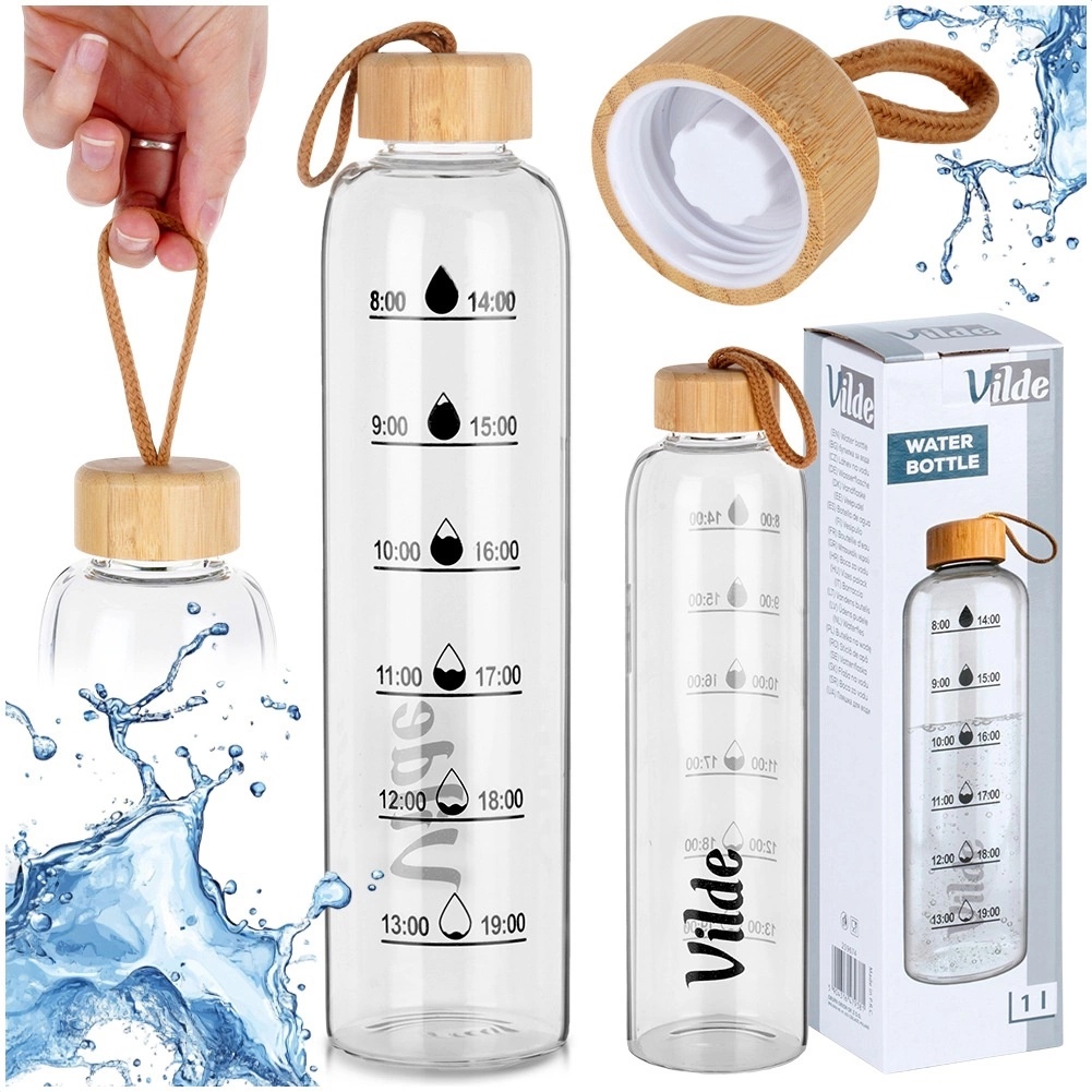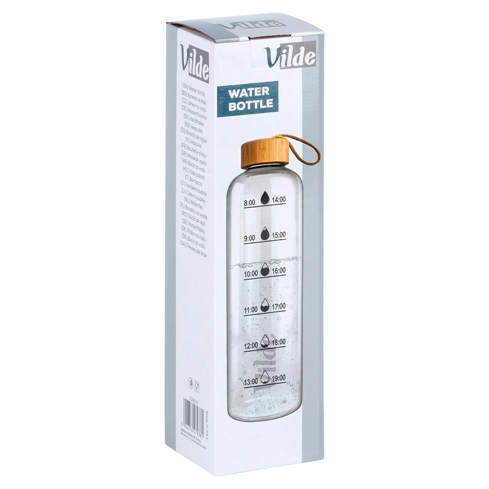 Стъклената бутилка VILDE съчетава изчистен дизайн и практични функции за всеки ден. Изработена е от боросиликатно стъкло, което е леко, издръжливо и понася температурни разлики, за да се наслаждавате на вода, чай и домашни лимонади. Бамбуковата капачка със силиконово уплътнение задържа съдържанието надеждно, а благодарение на примката се пренася лесно.