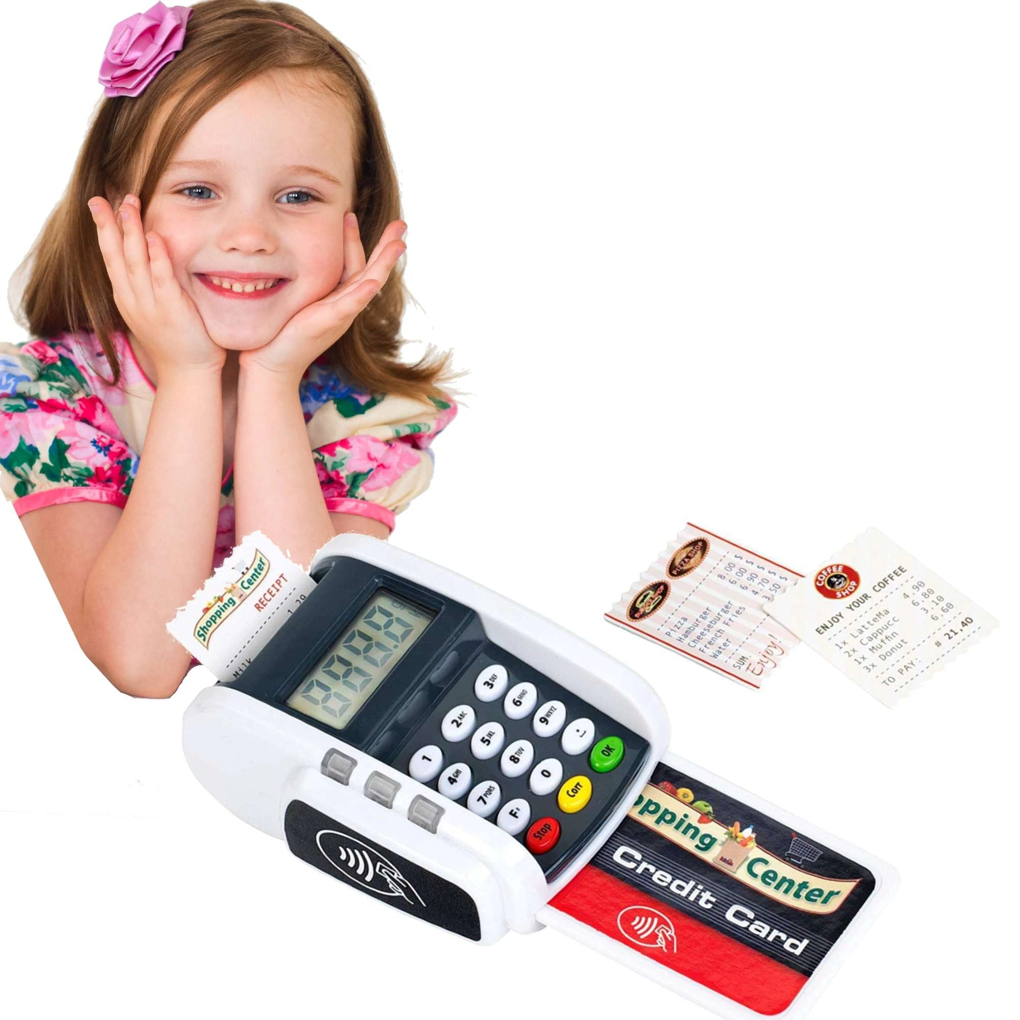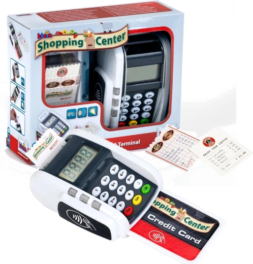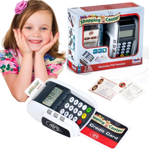 Този компактен терминал правдоподобно имитира истинско устройство: децата могат да натискат цифровата клавиатура, да доближават платежна карта и да „печатат“ касови бележки за по-реалистична игра на каса. Светлинните и звуковите ефекти придават на всяка транзакция необходимия реалистичен нюанс и подпомагат развитието на социалните умения.