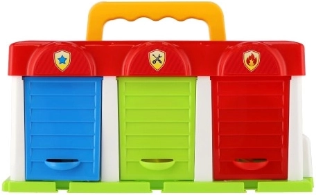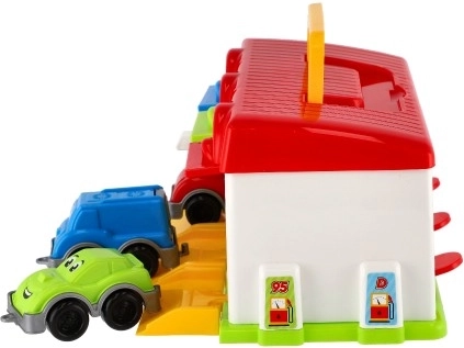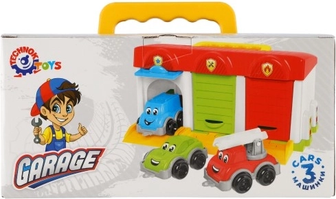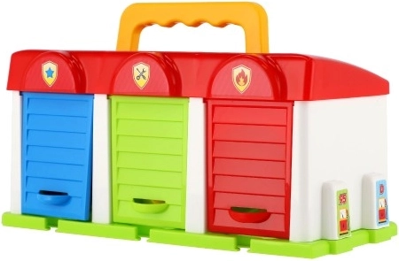 Този цветен пластмасов гараж е идеален за всеки малък любител на автомобили. Предлага място за съхранение на три коли, които са част от комплекта: пожарна кола, лек автомобил и ван. Всяка кола има собствен вход към гаража, което осигурява лесно влизане и излизане. Гаражът насърчава въображаемата игра и развива моторните умения на децата.