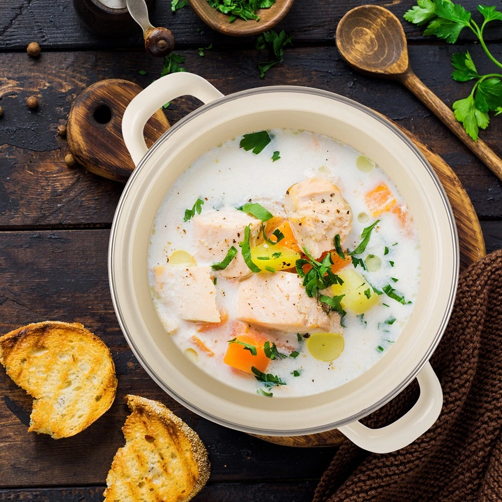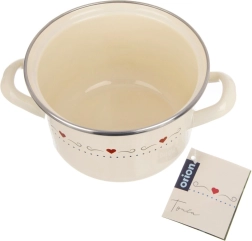 Стилна тенджера в ретро дизайн от висококачествена емайлирана стомана в кремав цвят с деликатен мотив на сърца. Практичният обем 1,4 л е идеален за супи, сосове, гарнитури и готвене за всеки ден. Емайлът е издръжлив, лесен за почистване и щадящ здравето – подходящ и за алергични хора.