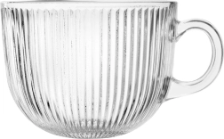 Тази просторна чаша с дръжка съчетава непреходен дизайн и практичност. Прозрачното стъкло с вертикално набраздяване придава елегантен вид, подобрява захвата и подчертава цветовете на чай, кафе или лимонада. Благодарение на обема от 500 ml удобно сервирате лате, насипен чай и билкови настойки.