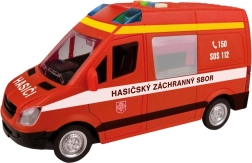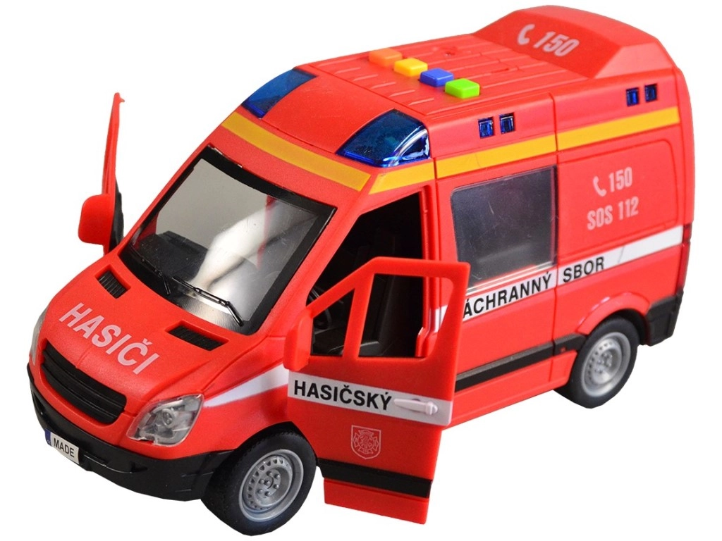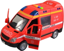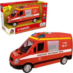 Този пожарен микробус ще зарадва всички малки спасители с реалистичния си дизайн и функции. При натискане на бутоните ще чуете чешки глас на диспечера и екипажа и ще видите мигащ маяк. Благодарение на инерционното задвижване е достатъчно леко да го бутнете и тръгва напред.
