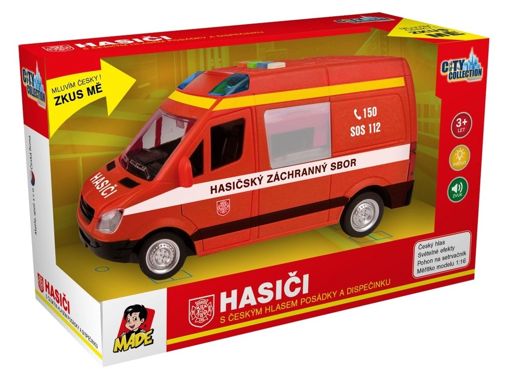 Станете малък герой с тази детайлно изработена играчка – пожарен микробус с инерционен механизъм с светлинни ефекти и реалистични чешки реплики на екипажа и диспечера. Моделът в мащаб 1:16 предлага забавление благодарение на инерционното задвижване и звук на сирена. В комплекта са включени батерии.