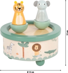 Тази класическа музикална кутия носи на децата спокойно настроение преди сън и радост по време на игра. Двете дървени фигурки – тигър и слон – се задържат отгоре с помощта на магнити, по време на възпроизвеждане се въртят и могат лесно да се свалят за самостоятелна игра. Качествените бои и гладките повърхности са щадящи за детските ръчички.