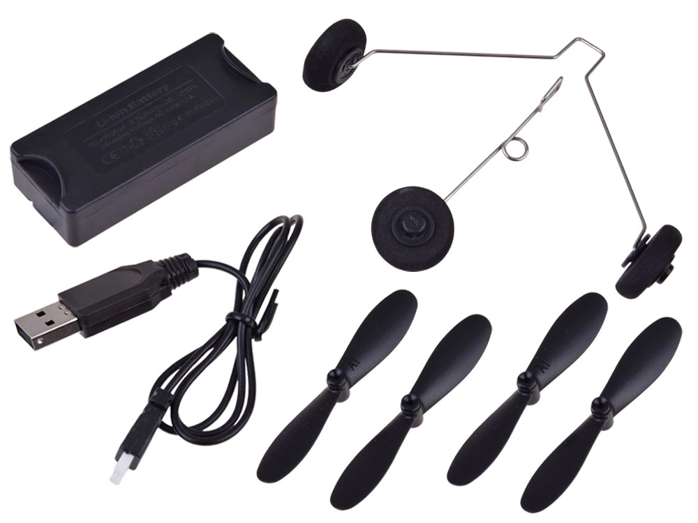 В комплекта ще намерите резервни перки, колесник, USB кабел и RC предавател 2,4 GHz. Нужно е само да сглобите, заредите и да полетите.