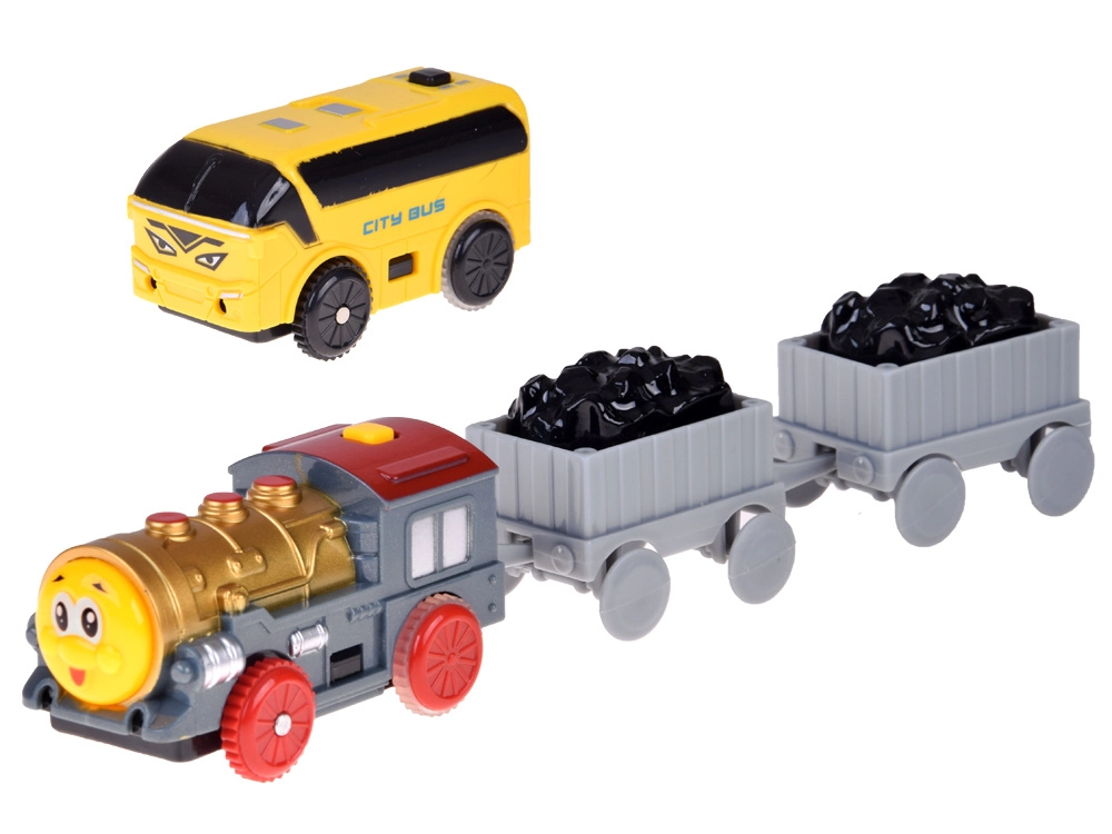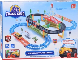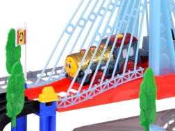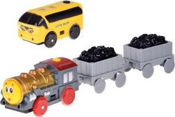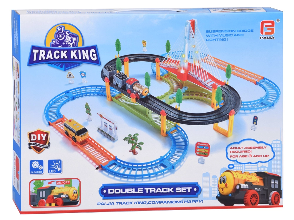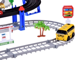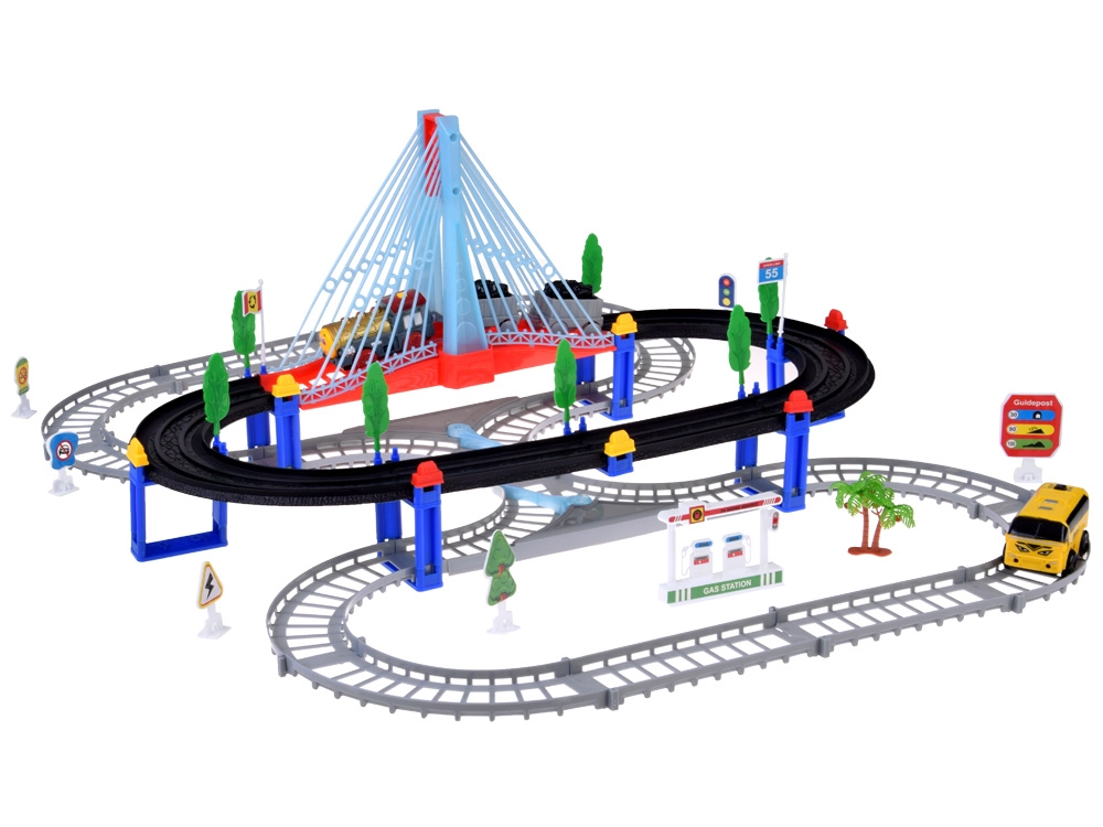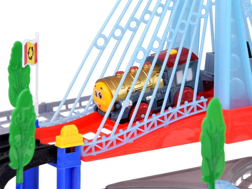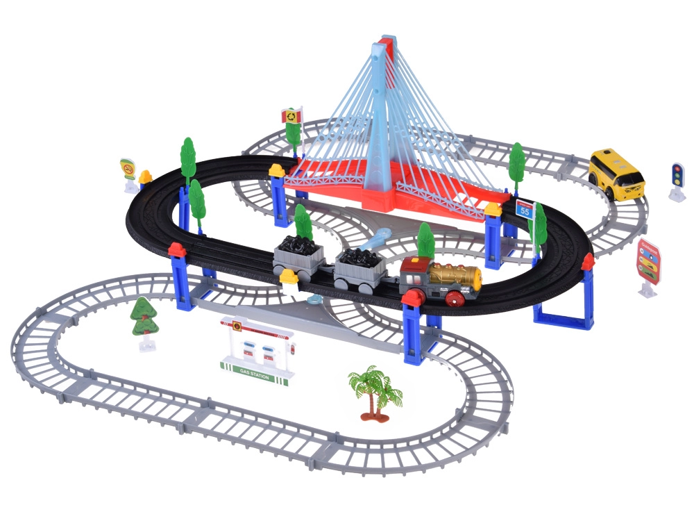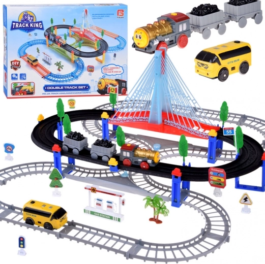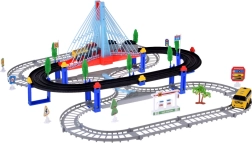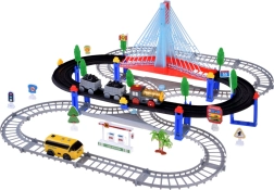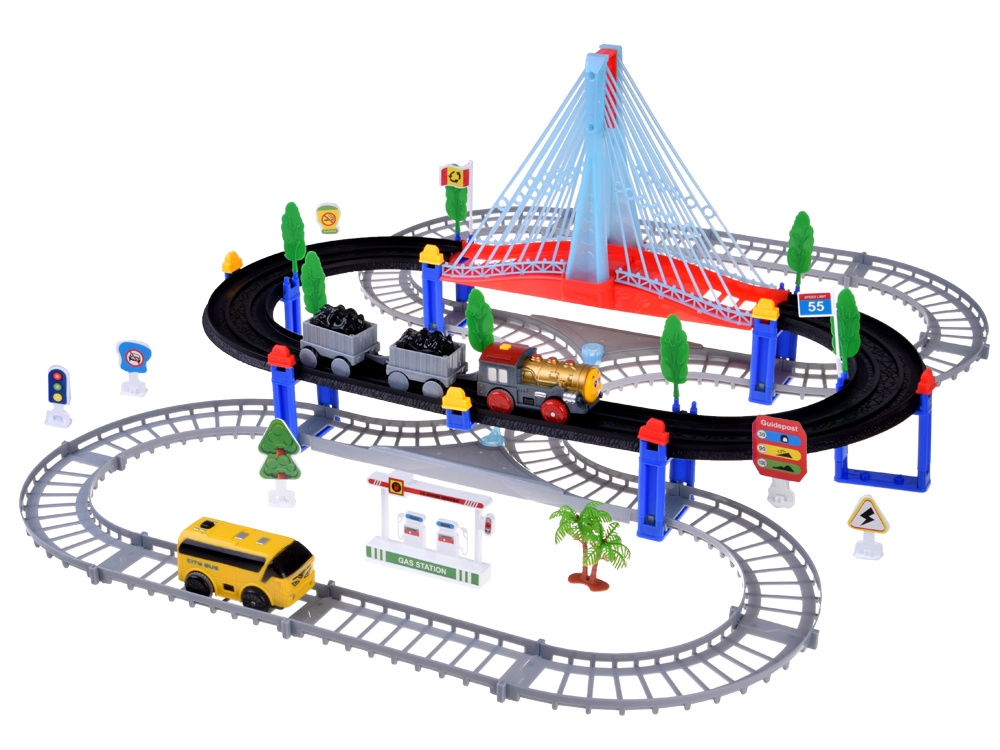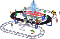 Тази електрическа влакова писта с многониво релси и висящ мост носи на децата часове творческа игра. Локомотивът с вагони и жълтият градски автобус се движат по свързани трасета, преминават по моста и покрай пътни знаци, дръвчета и малка бензиностанция. LED осветлението и звуците на локомотива с мелодии придават автентичност на играта.