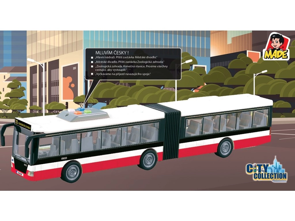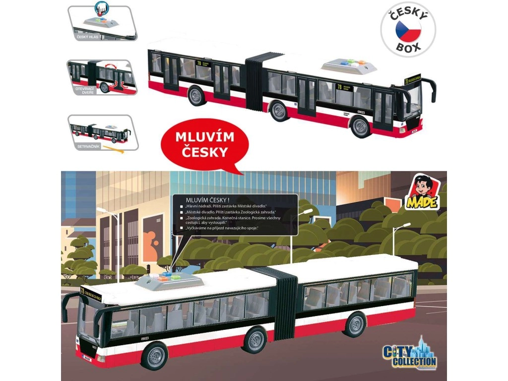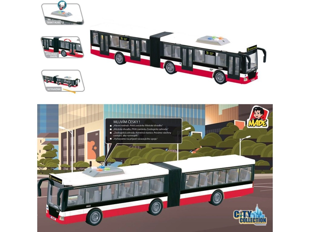 Този детайлно изработен съчленен автобус носи на децата реалистично изживяване от градския транспорт. Благодарение на инерционното задвижване се потегля лесно, а светлинните аксесоари заедно с чешките съобщения за спирките усилват играта и развиват въображението.