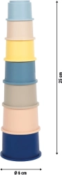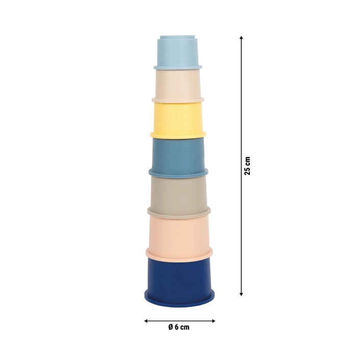Чашките се прибират една в друга за спестяване на място. Издръжливият материал се почиства лесно и е подходящ за игра у дома и навън.