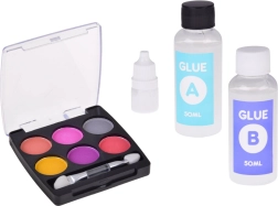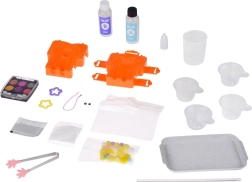Комплектът съдържа форма, щипчици, бъркалка, лепила, пигмент, меки топченца, звездички, очички, декоративно пликче, верижка и още – можете да започнете веднага.