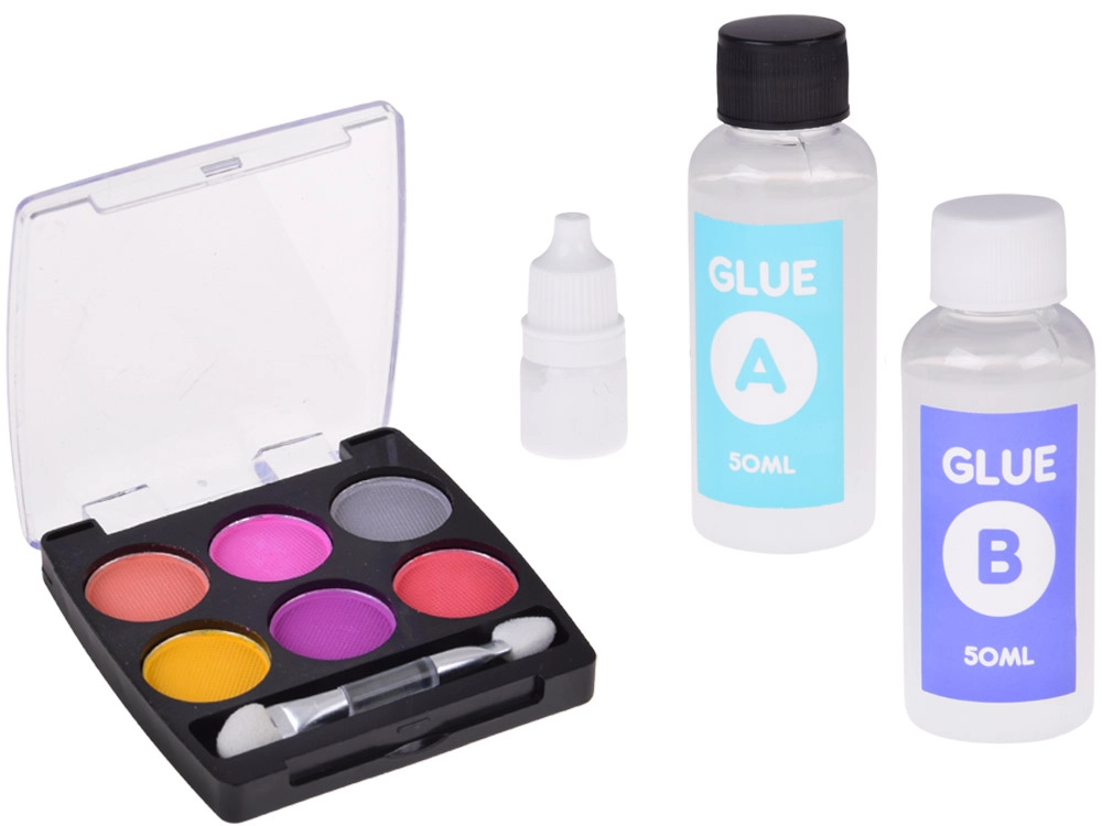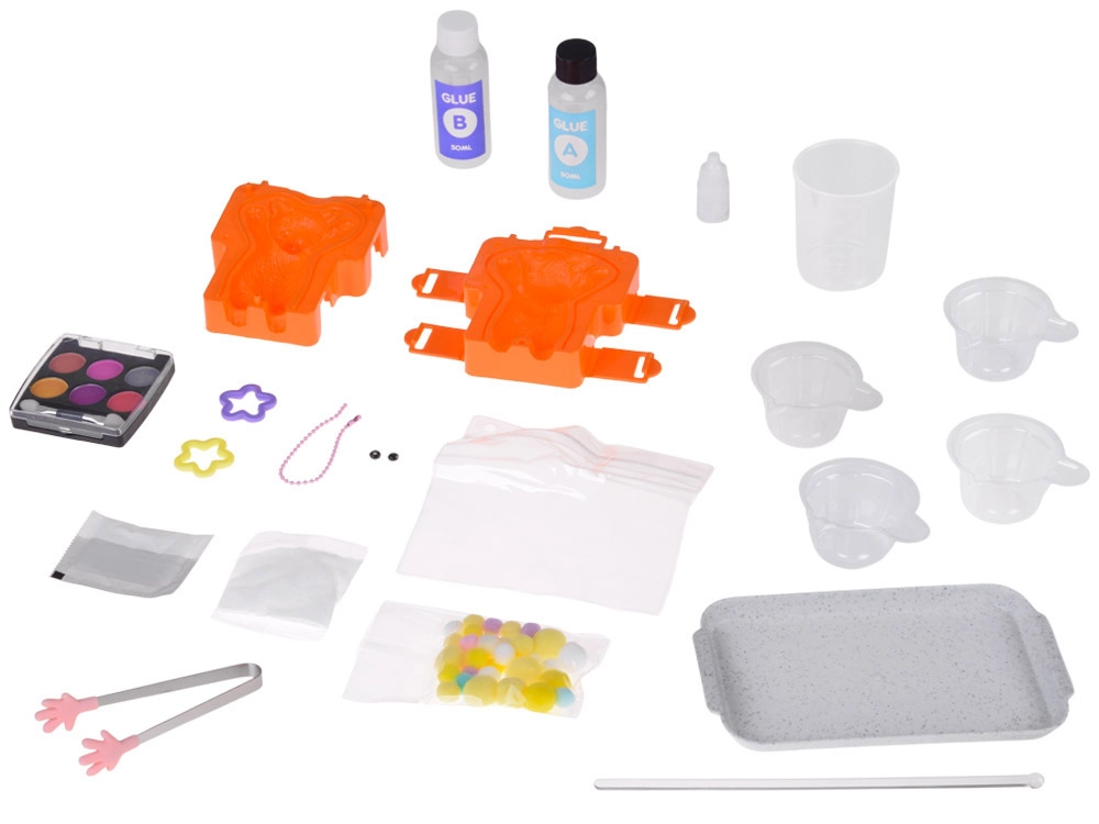 В комплекта има форма, щипки, бъркалка, мерителна чашка, 2× лепило, пигмент, декорации, ръкавици и практична купичка и подложка за чисто и удобно творчество. Простият наръчник води децата стъпка по стъпка – от смесването на масата до финалната декорация и закачане.