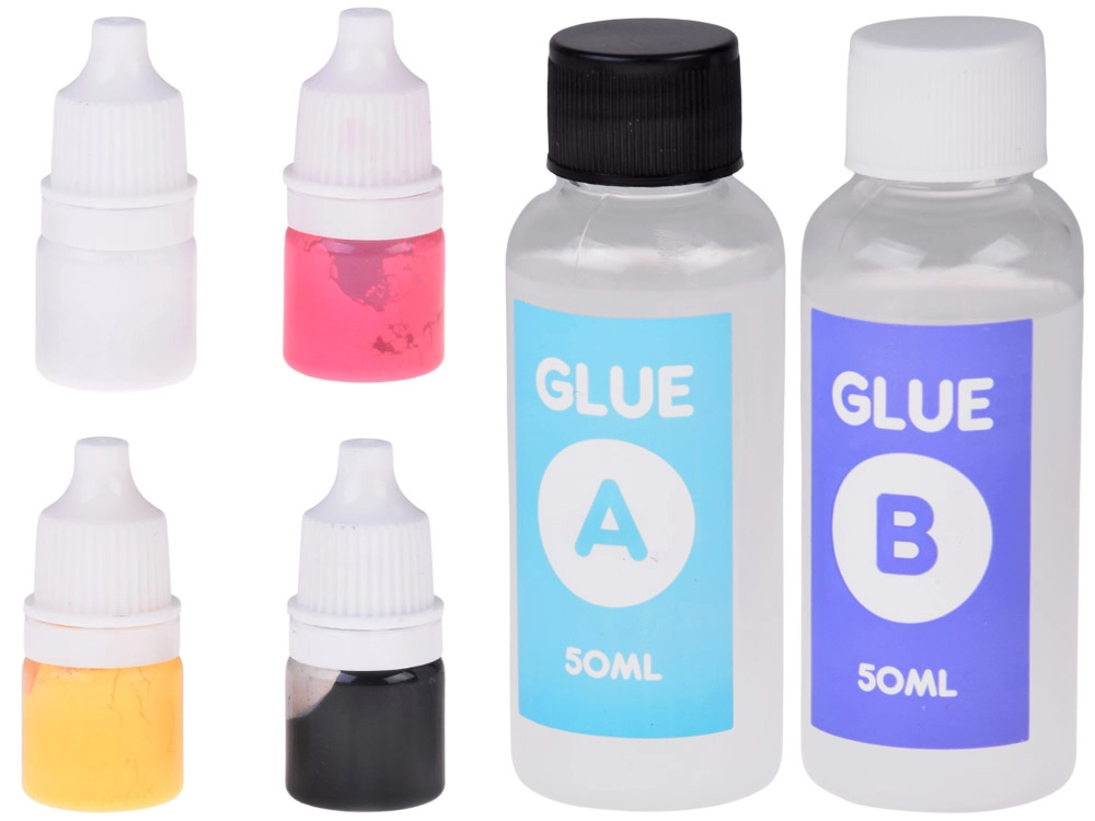 - Форма за 4 слузa, бъркалка-шпатула, пластмасов нож, 2× лепило (A+B), мерителна чашка, 4× оцветител, меки декоративни топченца, предпазни ръкавици, 4× звездичка, 4× прозрачна чашка, 4× декоративна торбичка, 4× верижка за ключодържател, подложка