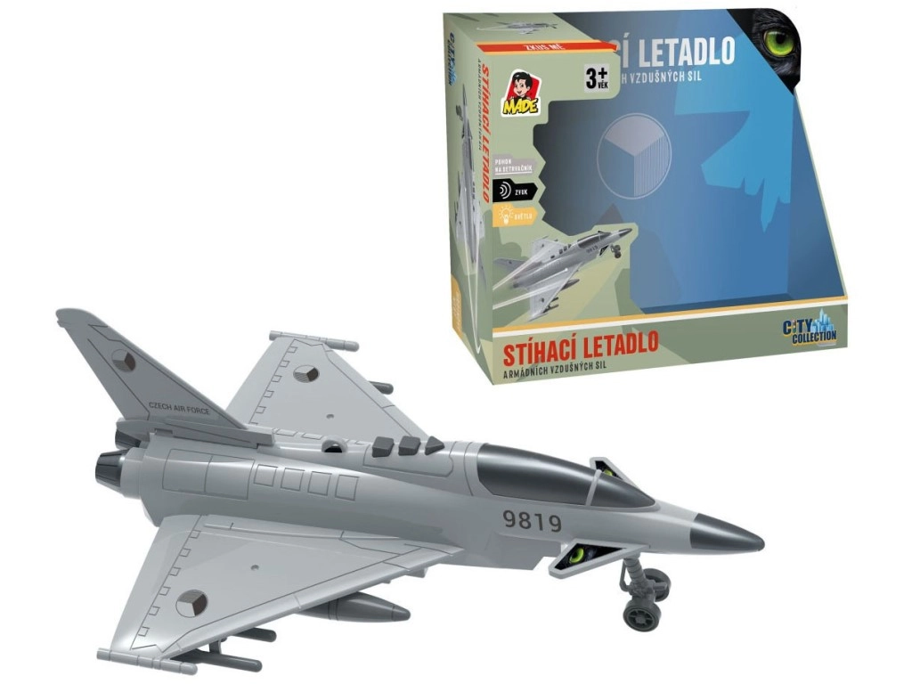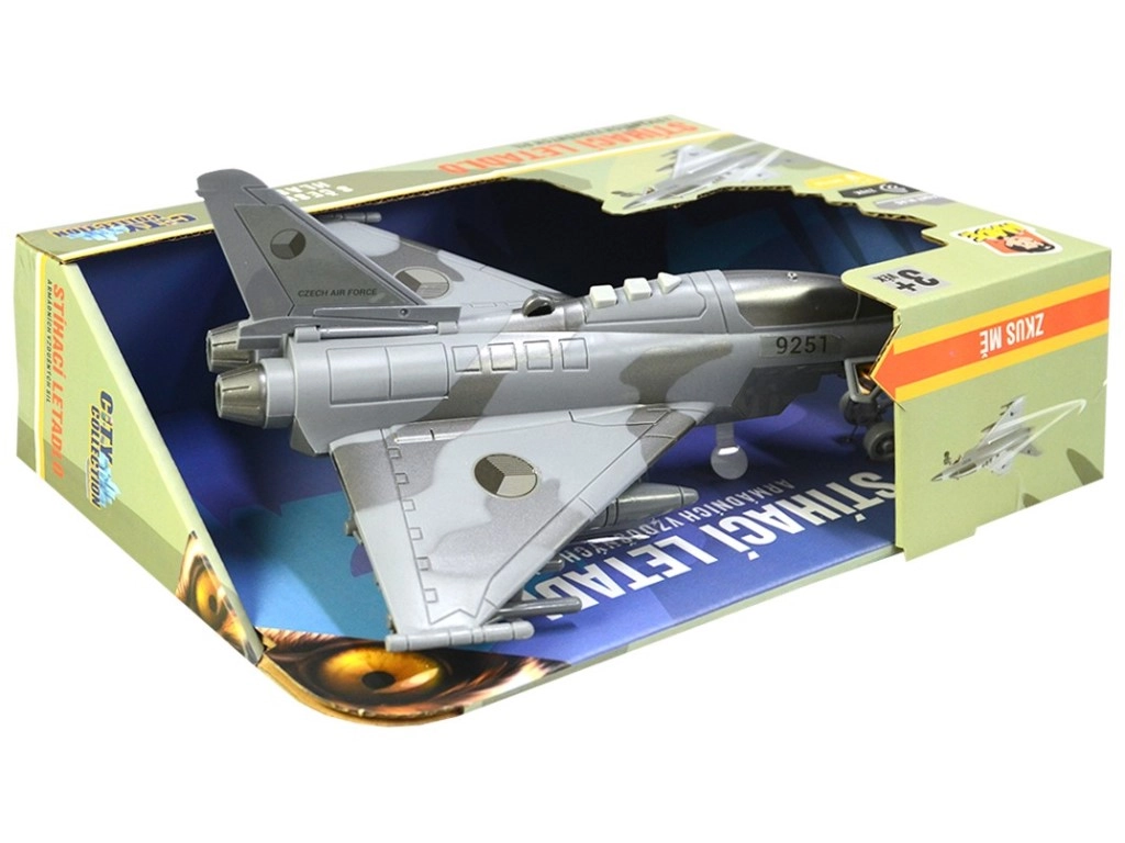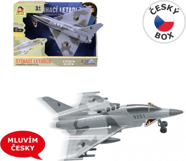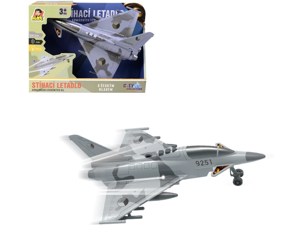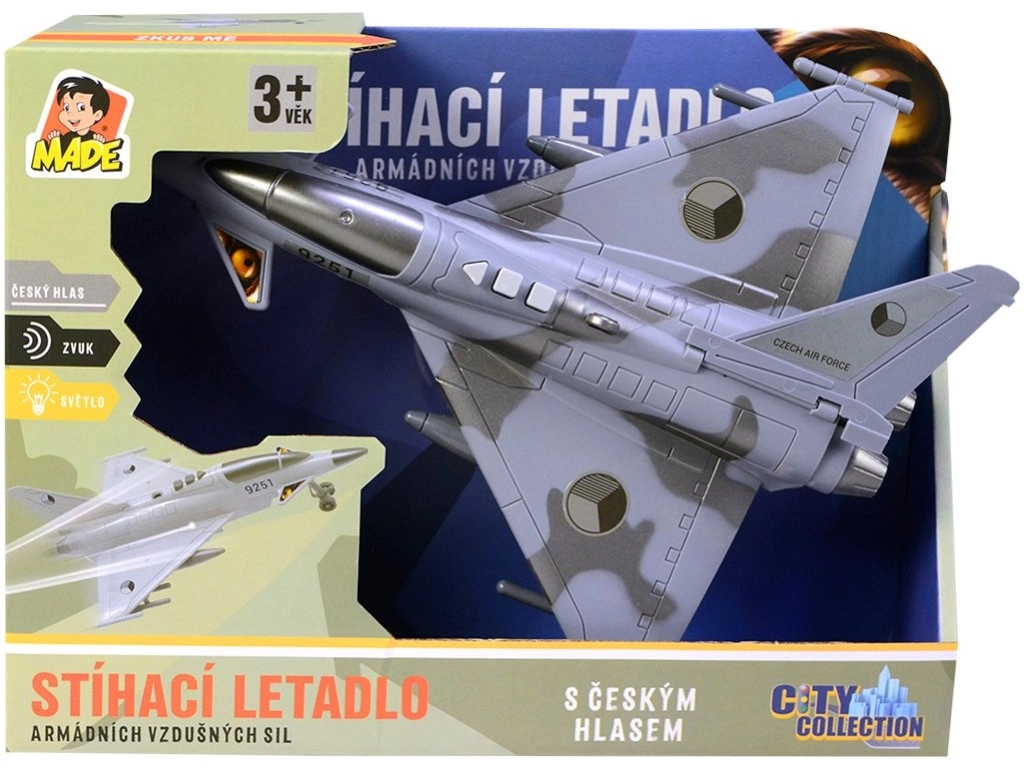 Насладете се на екшън въздушни мисии с детайлно изработен изтребител, украсен с отличителните знаци на Чешката република. Моделът предлага автентични диалози на чешки между диспечерската кула и пилота, светлинни ефекти и звук на летящ изтребител, които подсилват атмосферата на играта.