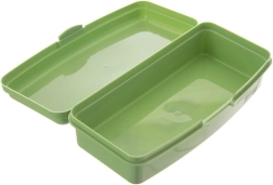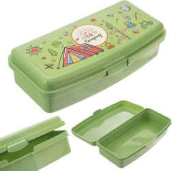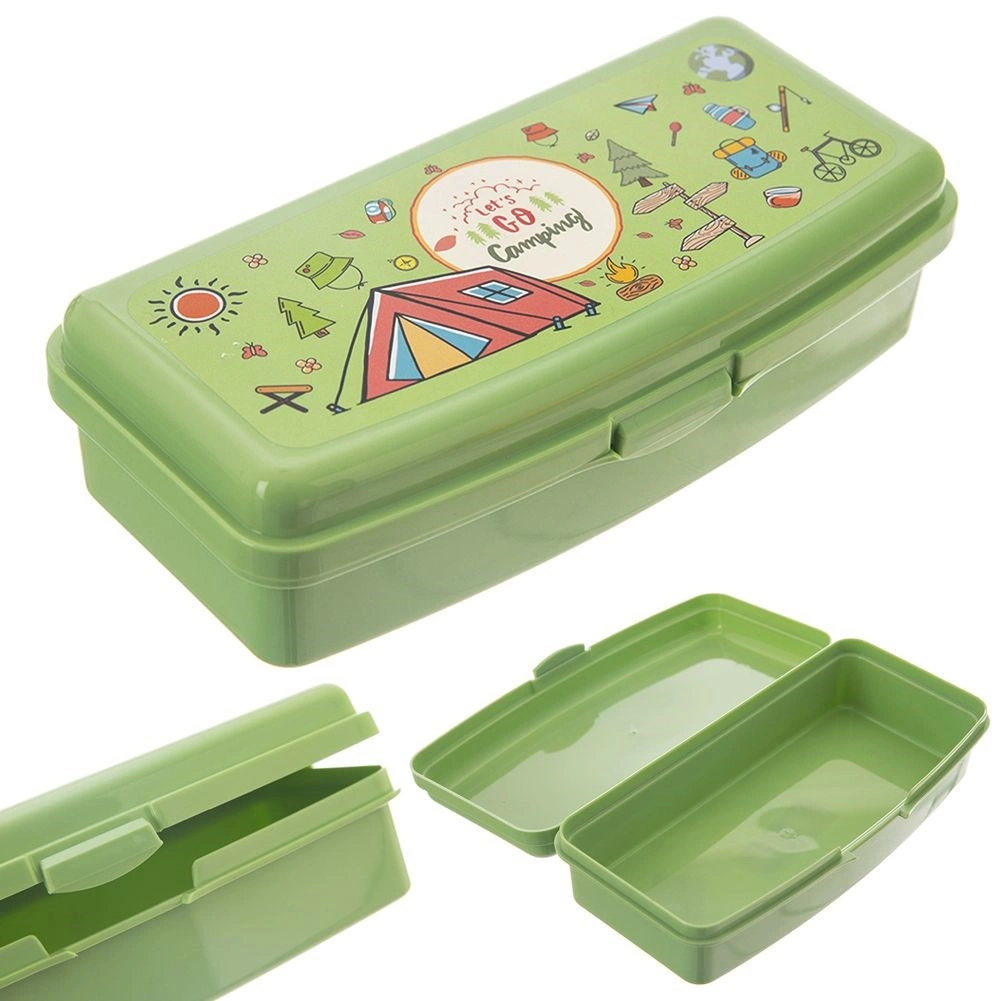 Практична кутия за закуска с обем 500 мл в зелено, идеална за канапета, междинни хапвания и дребни лакомства. Има компактни размери 21 × 9,5 × 5,5 см, здрава изработка от качествен пластмасов материал и надеждно закопчаване с клипс, което помага да се запази свежестта. Декорирана е с атрактивен къмпинг мотив, благодарение на който децата лесно разпознават своята кутия.