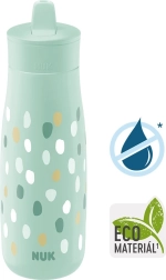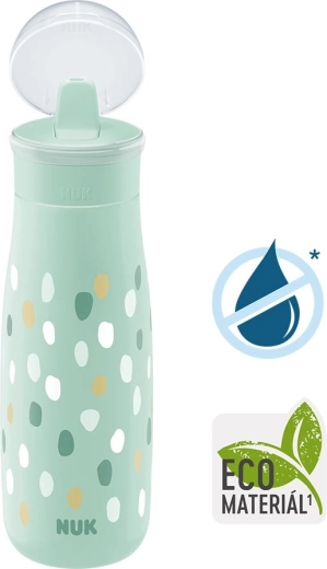 NUK Mini-Me Flip е идеалният спътник за малки откриватели. Благодарение на накрайника 2-в-1 детето може да избере дали да пие през сламка или директно. Материалът на накрайника е устойчив на захапване, така че без проблем понася първите зъбки. Бутилката е проектирана с акцент върху устойчивостта и качеството – корпусът е изработен 82% от устойчиви материали и не съдържа BPA.