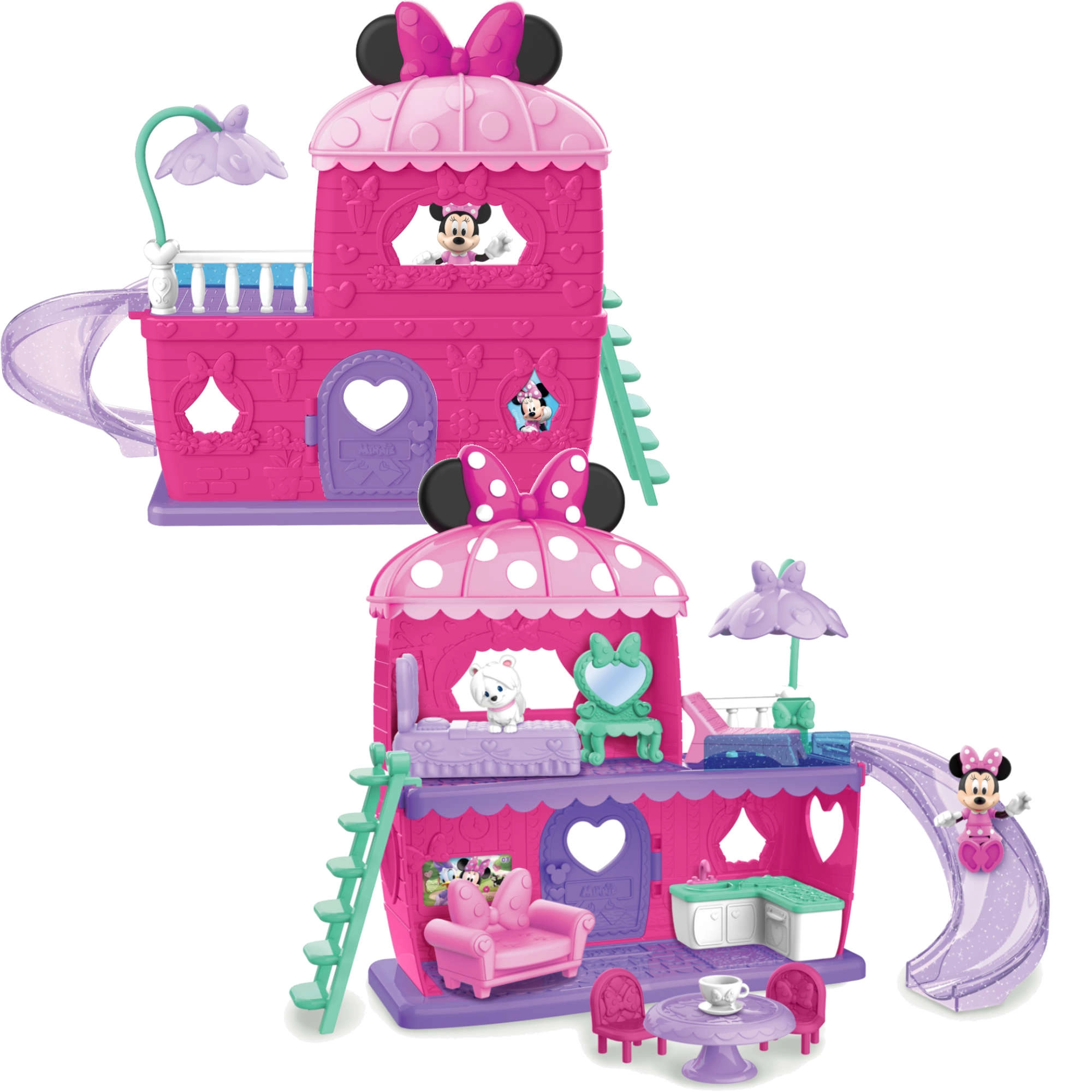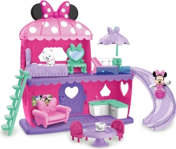 Комплектът включва 2 фигурки (високи около 7,5 cm) и богати аксесоари, включително мебели. Децата могат да пускат фигурките по пързалката, да се изкачват по стълбичките и отново и отново да пренареждат интериора. Идеален като подарък за деца от 3 години и като разширение на колекцията играчки с тема Minnie.