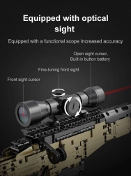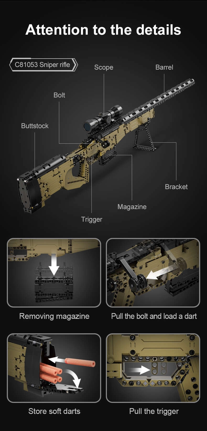Този детайлен конструктор от марката DOUBLE EAGLE/CADA предлага атрактивен проект за по-големи деца и тийнейджъри. Ще сглобите впечатляващ модел на снайперска пушка SNIPER RIFLE с множество подвижни части, включително пълнител и прицелна оптика. Благодарение на включения ремък моделът се пренася лесно.