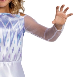 Горната част е украсена с геометрични „ледени“ мотиви и фин блясък, които придават на костюма автентична визия на любимия персонаж от Frozen.