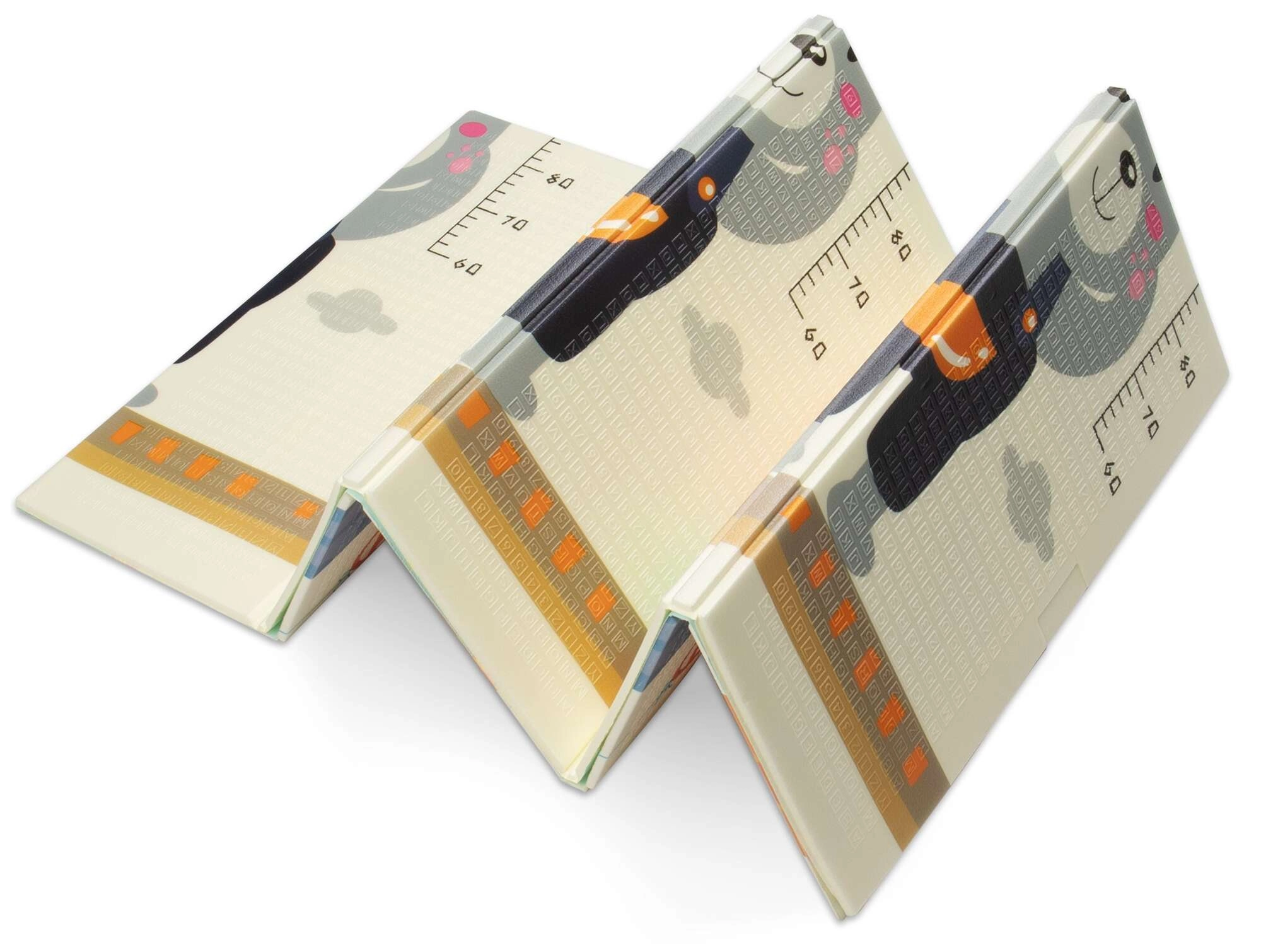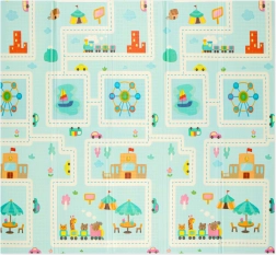 Постелката HUMBI е изработена от премиум, без мирис, нетоксична пяна XPE, която отлично омекотява ударите, изолира от студ и благодарение на противоплъзгащата се структура подпомага безопасното учене на пълзене и ходене. Двулицевият печат предлага мили животински мотиви с височинна мерилка и втора страна с цветни улички и превозни средства за развитие на въображението.