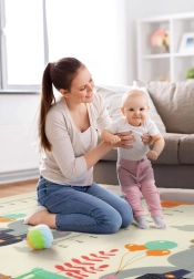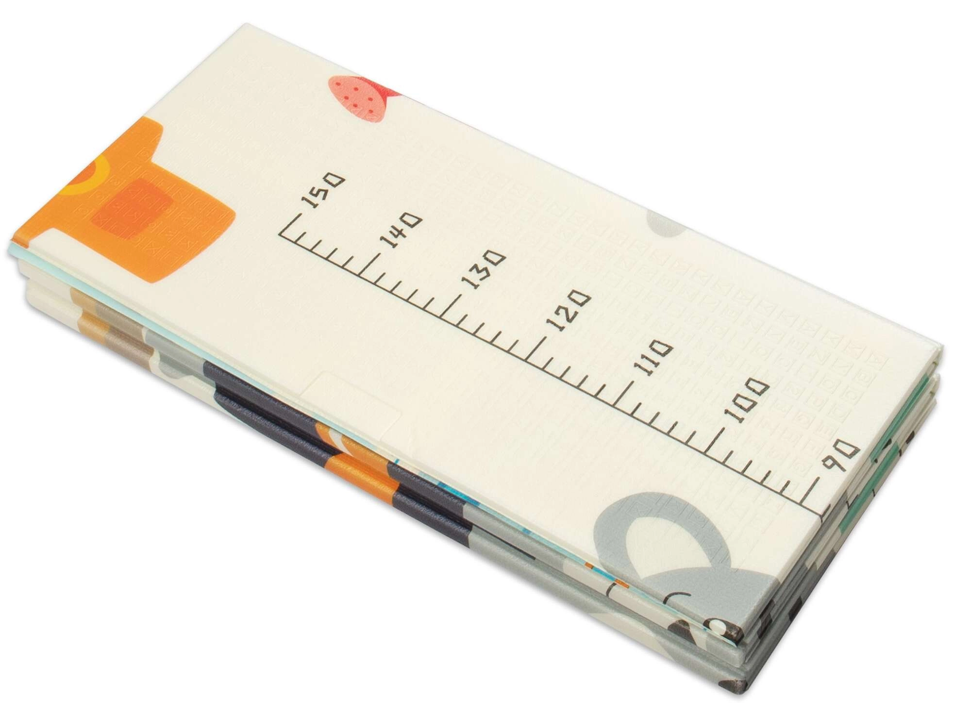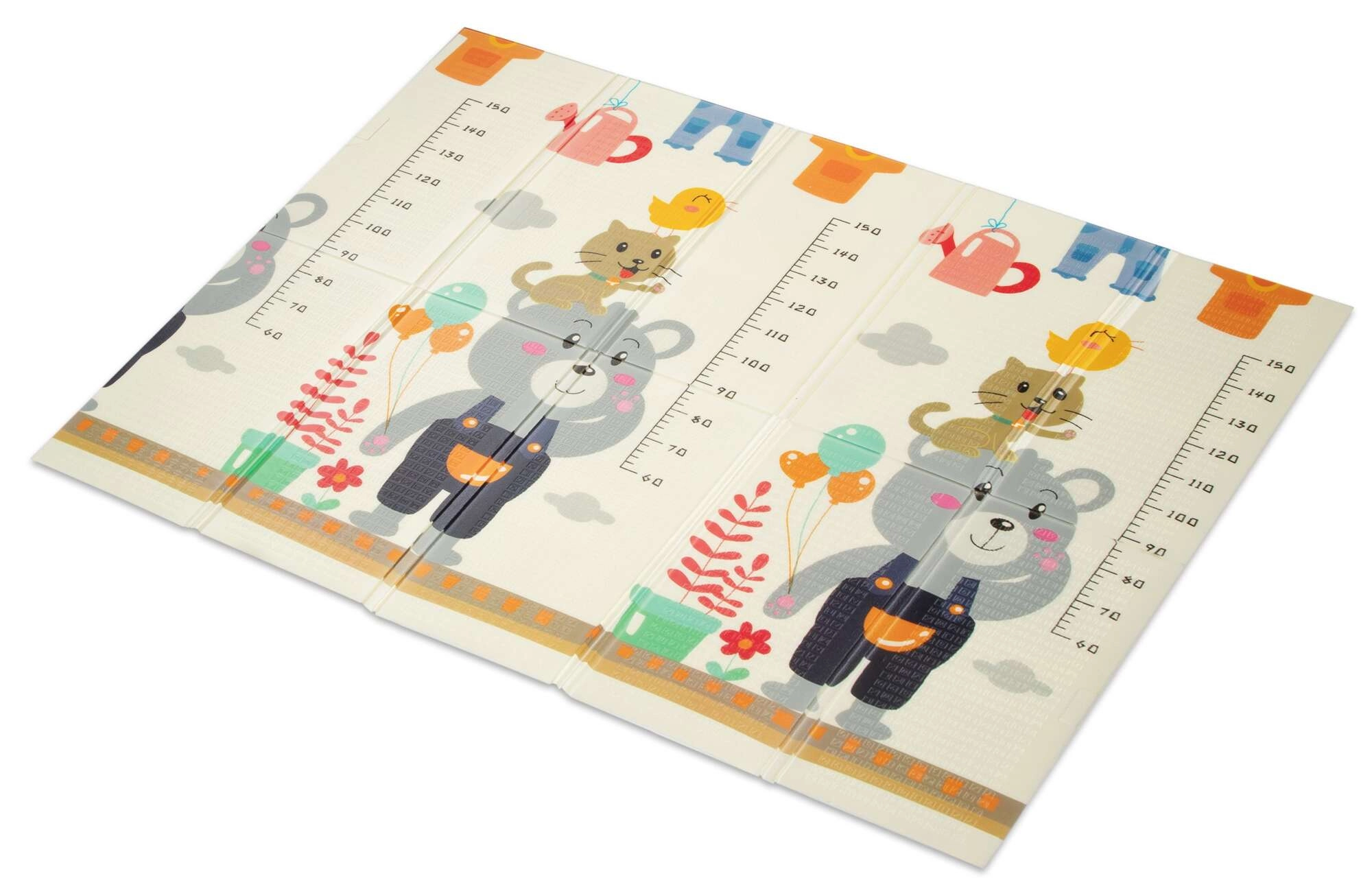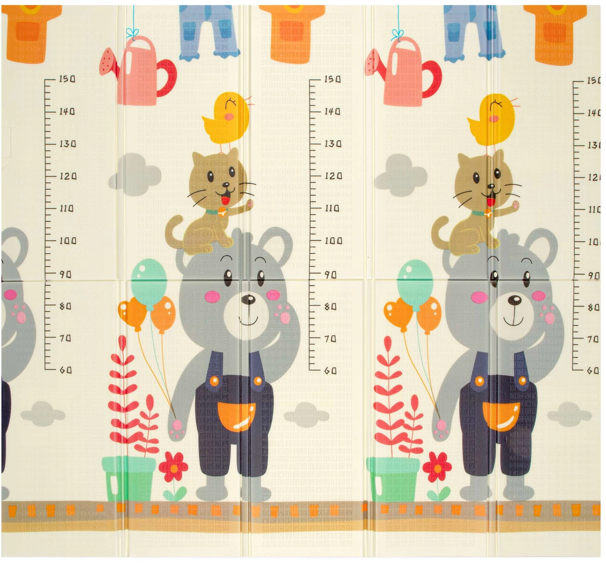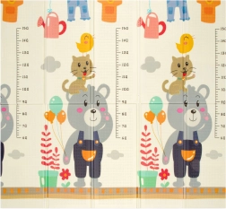 Едната страна е с очарователни животни и скала за следене на растежа, а другата – с улички и колички за развитие на въображението по време на игра.