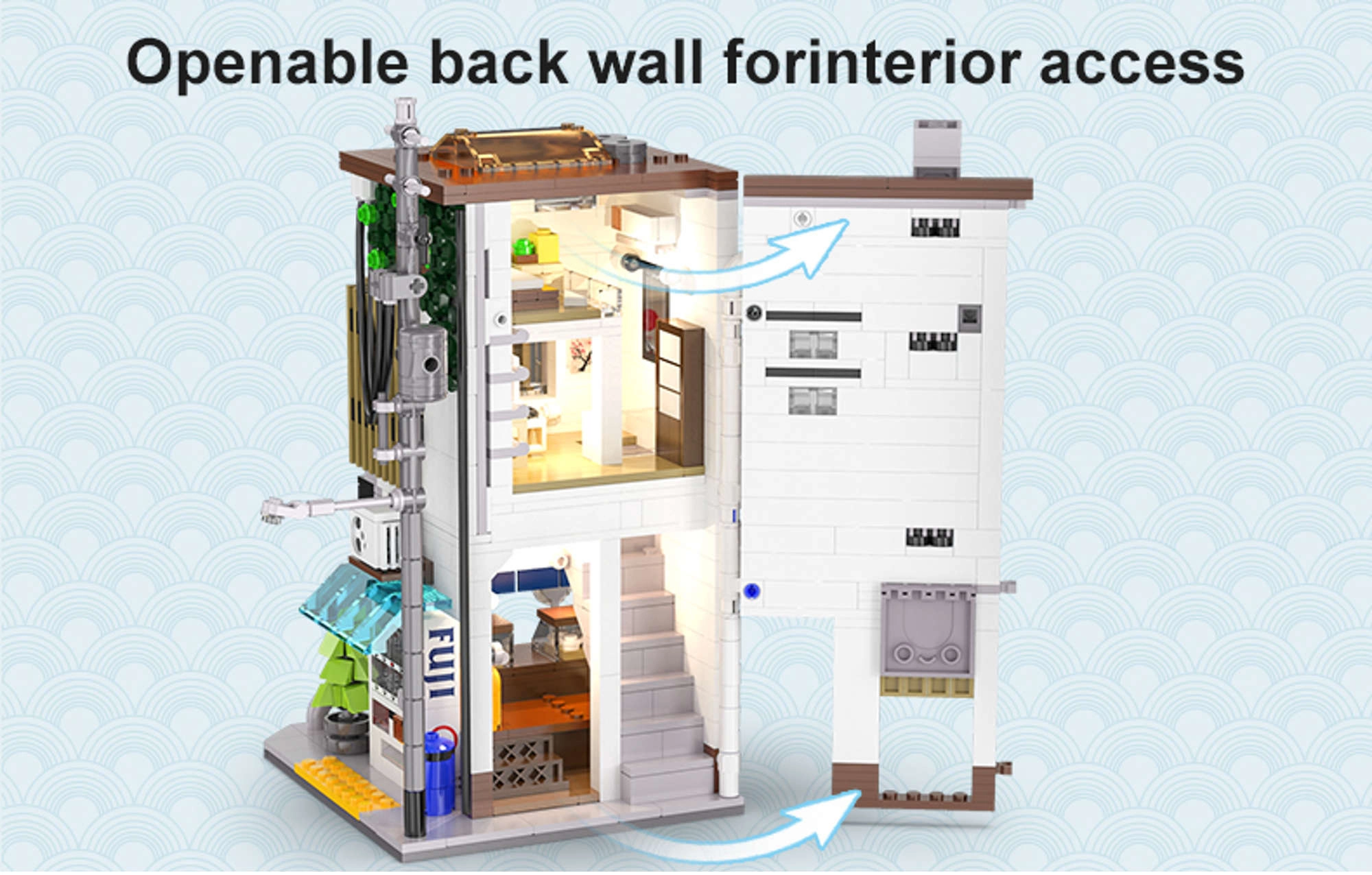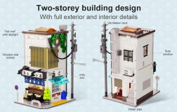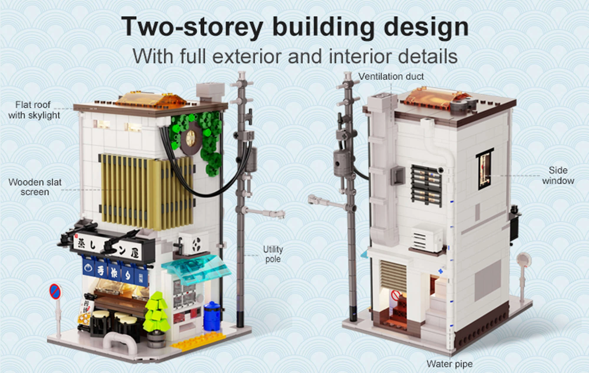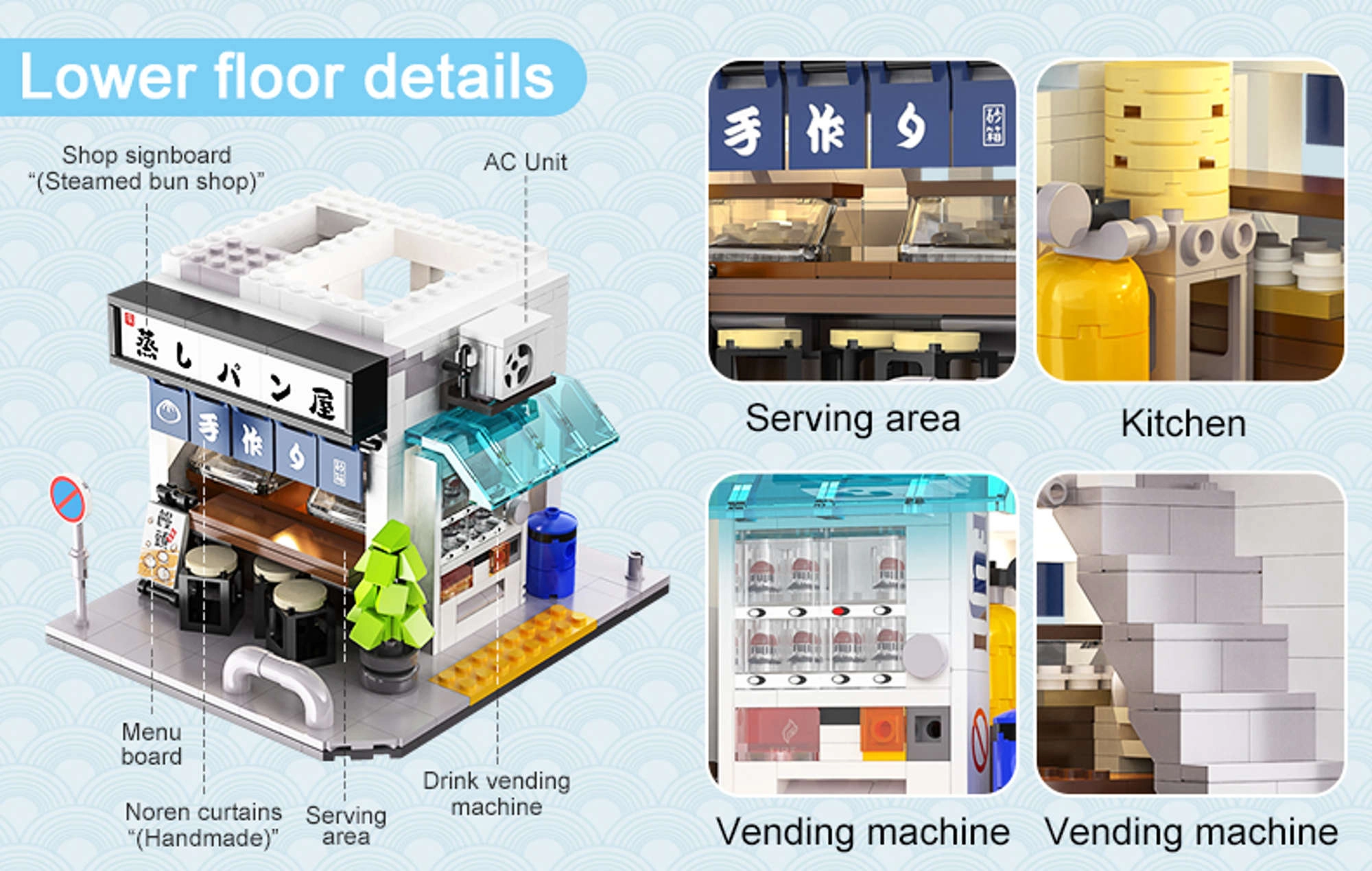 Този елегантен сет CaDA носи автентичната атмосфера на японските улички. Двуетажният магазин за парени питки впечатлява с реалистична фасада, функции за лесен достъп до интериора и LED модул, който добавя уникален вечерен облик на модела.