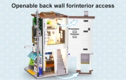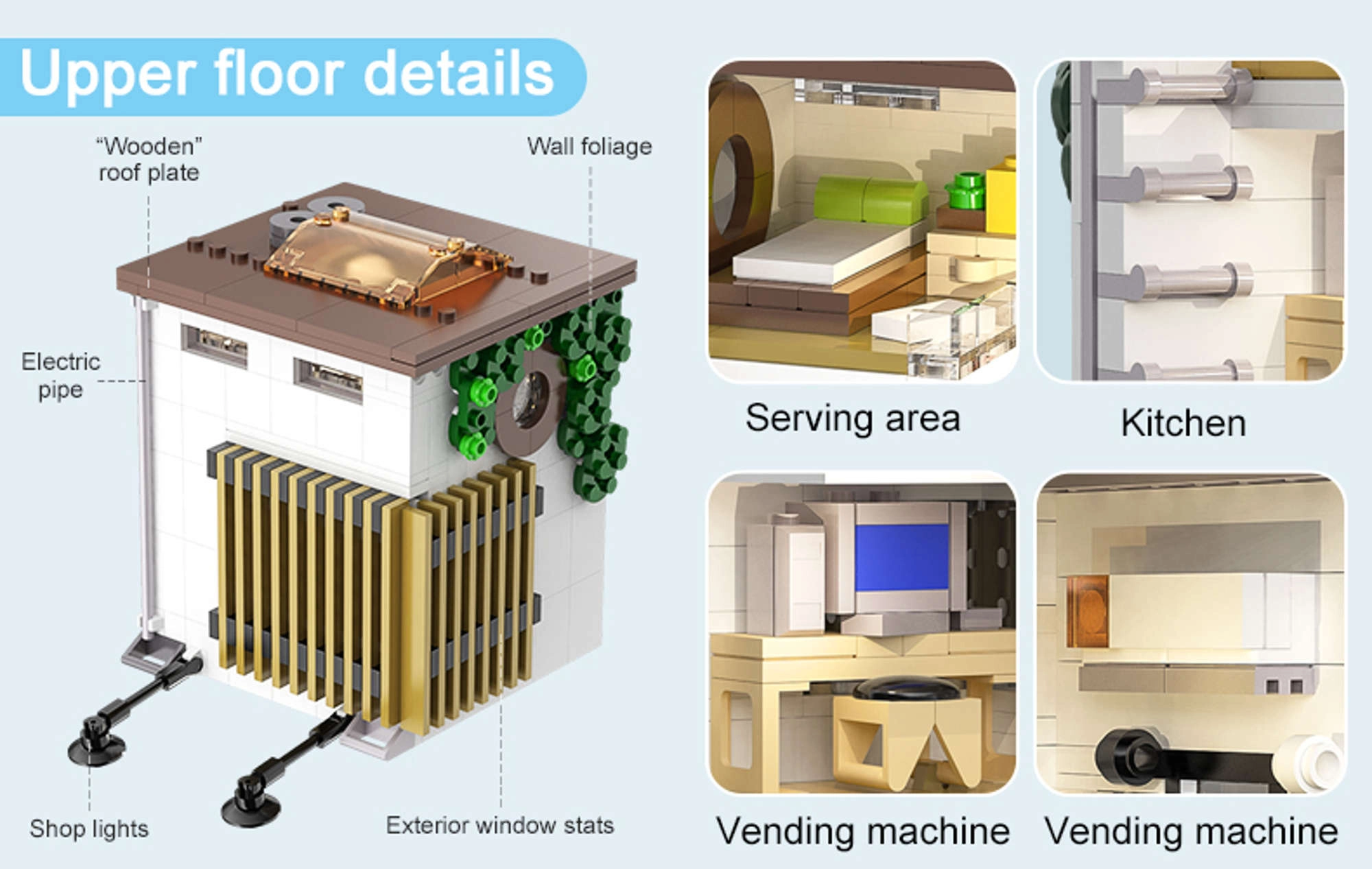 Отваряемият страничен панел разкрива детайлно оборудвани помещения – от продажбен щанд и автомат за напитки до стълбище и уютна спалня с компютър, легло, гардероб и климатик. Външните детайли като електрически стълб, вентилационен канал, прозорци, улук, климатик, изнесена табела и меню подчертават колекционерския характер на модела.