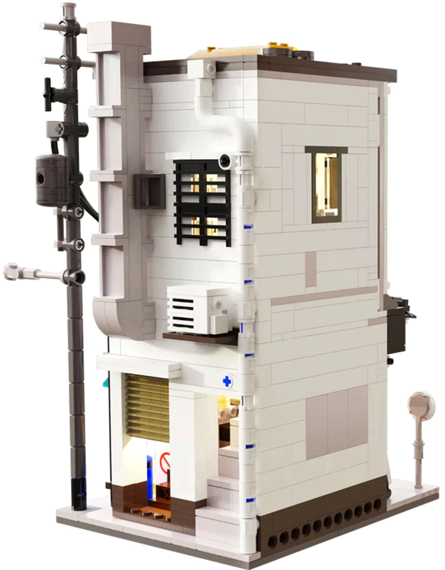 Електрически стълб, вентилационен канал, улук, климатик, табела и автомат за напитки придават автентичен вид на модела.