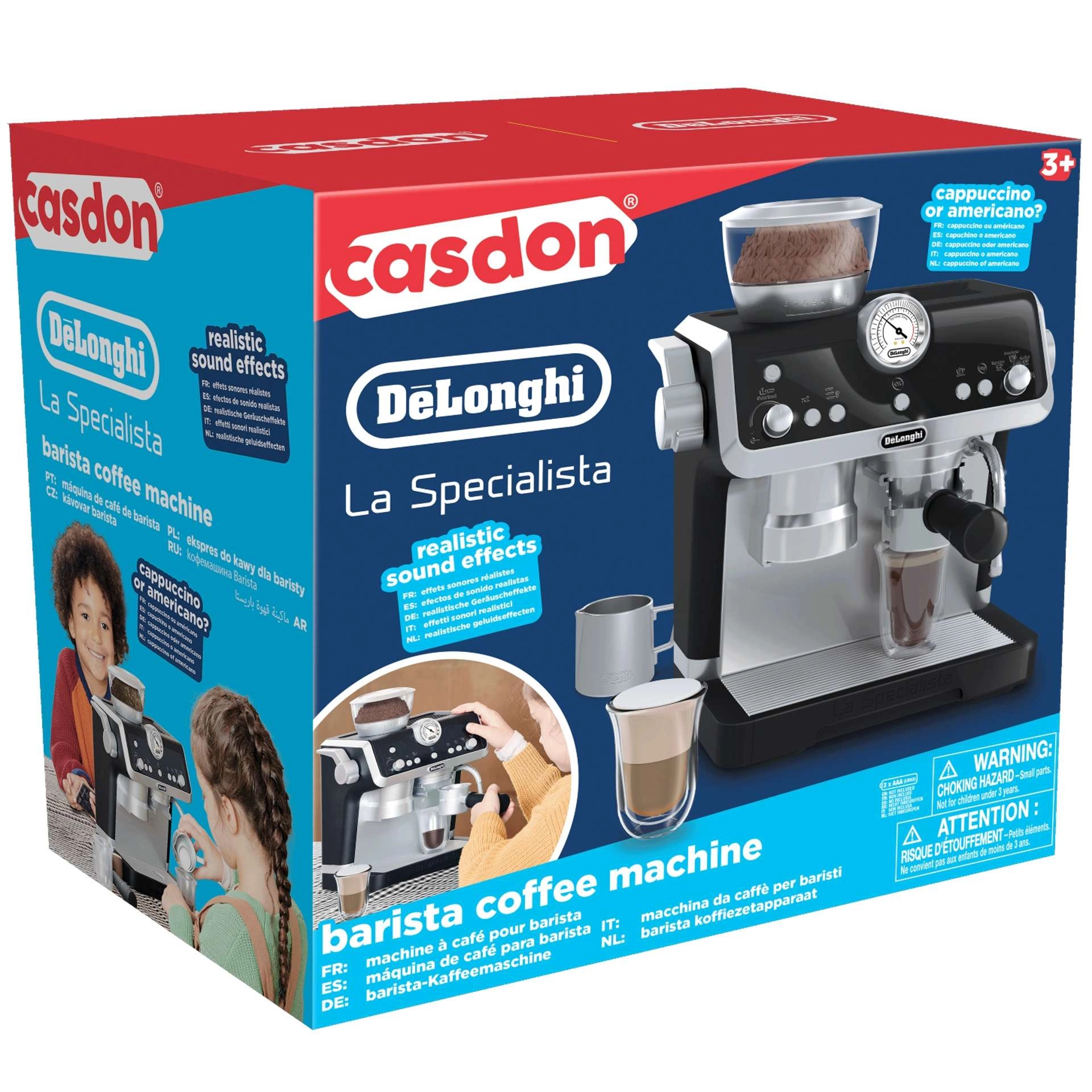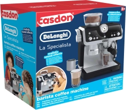 Станете истински бариста! Стилната детска кафемашина с лиценз De’Longhi от марката CASDON предлага реалистично смилане, приготовление на еспресо и разпенване на мляко със звукови ефекти. В комплекта има чашки, каничка и „кафе“ и „мляко“ за още по-автентична игра – идеално за развитие на фантазията и координацията на деца от 3 години.