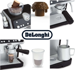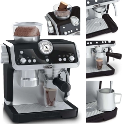 Тази модерна детска кафемашина в елегантна черно-бяла комбинация достоверно наподобява истинска еспресо машина с ръчка. Децата могат да „смилат“ зърна в горния контейнер, да щракнат ръчката (portafilter), да натиснат бутоните и да наблюдават как „кафето“ тече в чашите. За любителите на капучино има парна дюза с реалистични звуци за разпенване на „млякото“.