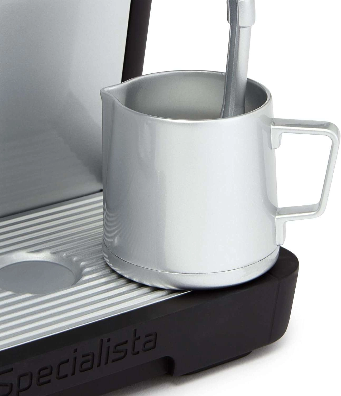 - Кафемашина с ръчка, сива каничка за мляко, 2 високи прозрачни чаши, ръчка/тампер, „кафе“ и „мляко“, наръчник