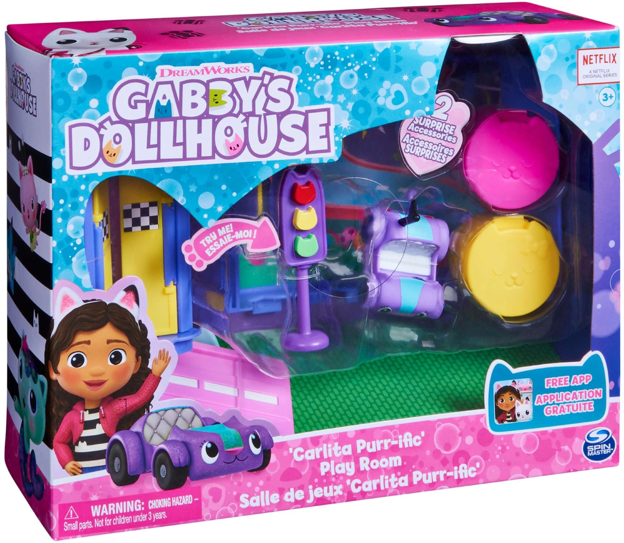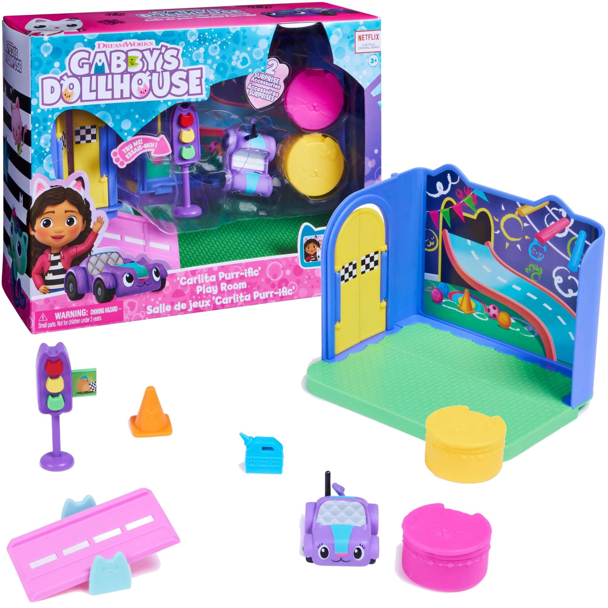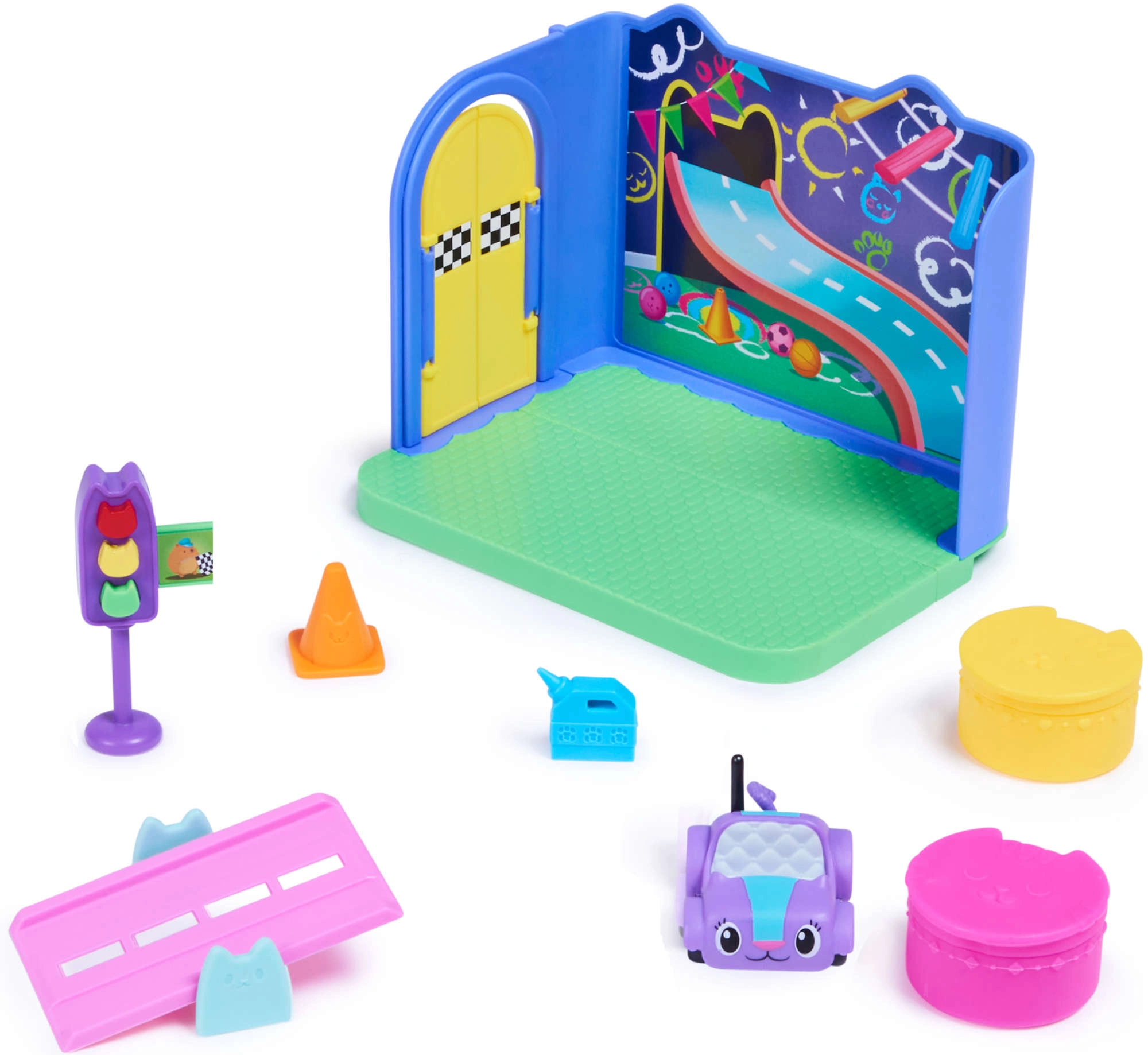 Открийте цветната стая на Котифър, вдъхновена от любимия сериал GABBY’S DOLLHOUSE. Децата ще обикнат спускането по рампата, спирането на светофара и отварянето на изненадите в кутийките. Комплектът развива въображението, фината моторика и създаването на собствени истории.