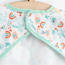 Закопчаването с велкро улеснява бързото обличане и събличане, а мекият преден джоб улавя трохи и капки. Престилката е подходяща за хранене, самостоятелно ядене и творчески дейности. Модерните десени и зеленият цвят ще зарадват деца и родители.