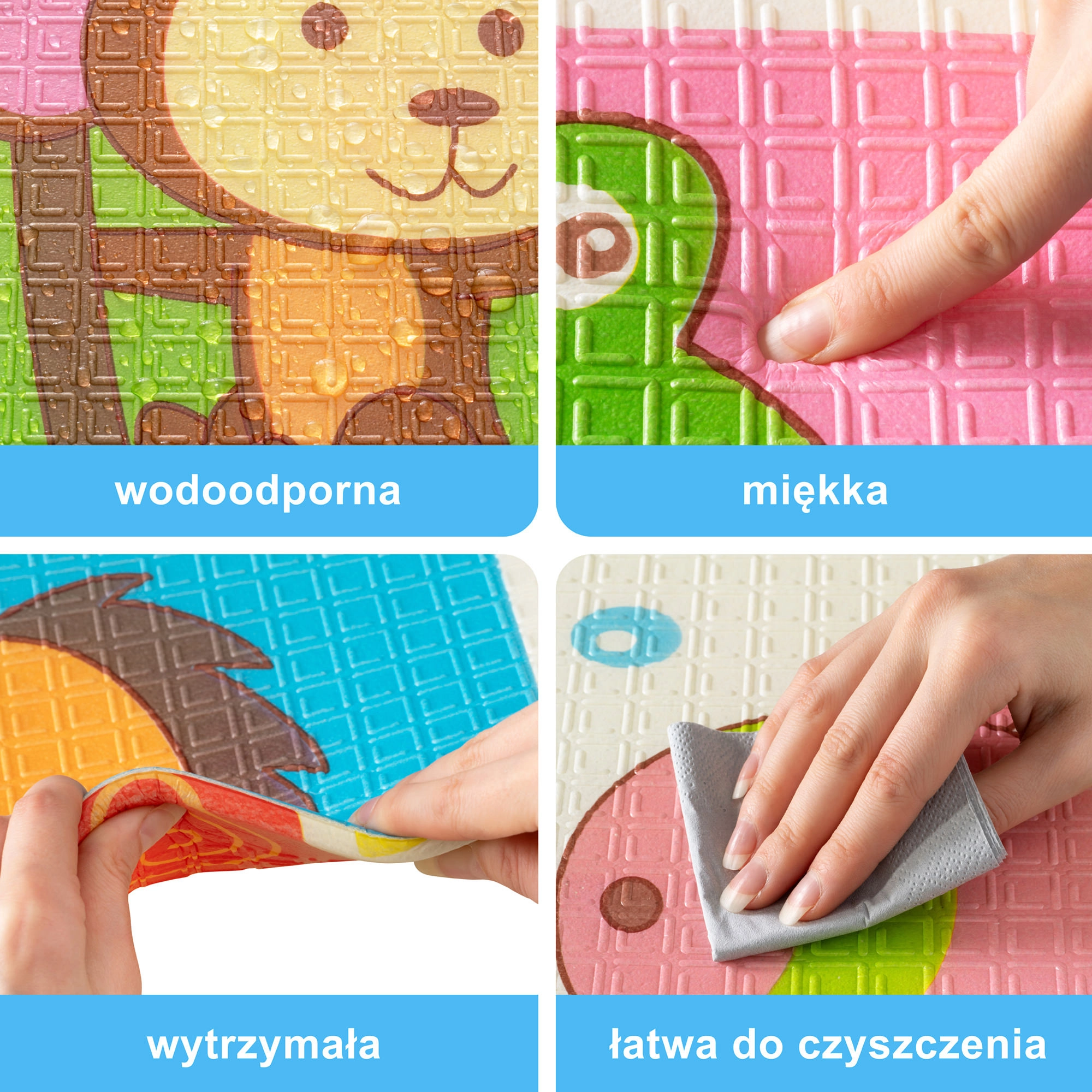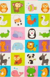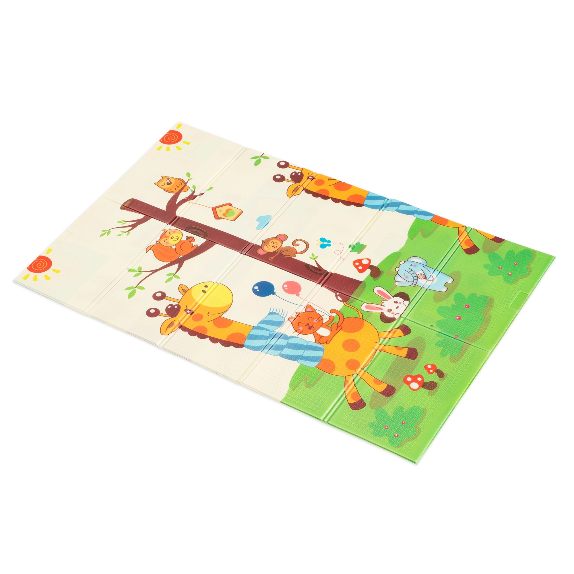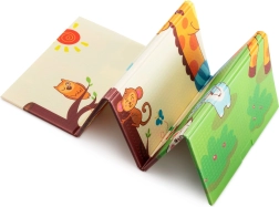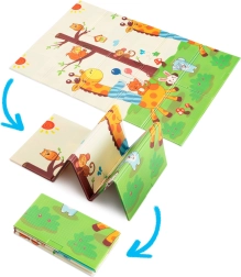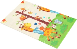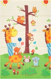 Премиум пяната XPE е без мирис, нетоксична и устойчива на износване. Благодарение на своята дебелина 0,8 cm отлично абсорбира удари и осигурява изолация от студения под. Двете страни са с атрактивни щампи – едната със сладки жирафи, другата с животни на цветен фон – които подпомагат визуалното развитие на децата.