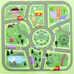 Пътища, кръгово кръстовище, паркове, езерце, сгради и пътни елементи развиват въображението и познанията по пътна безопасност. Идеално за колички и фигурки.