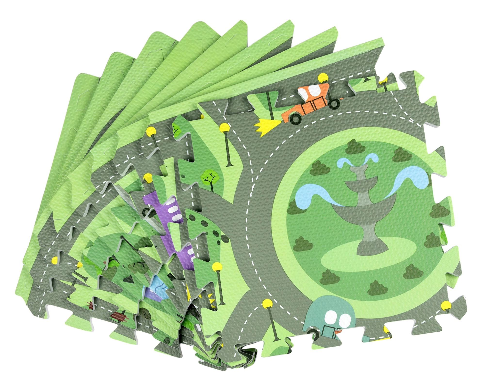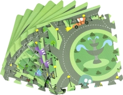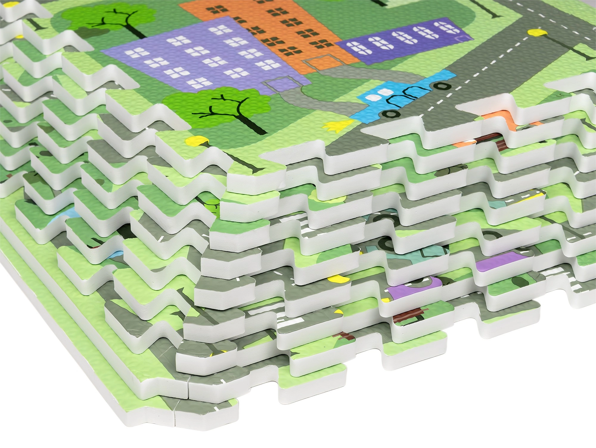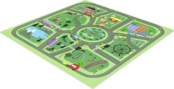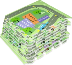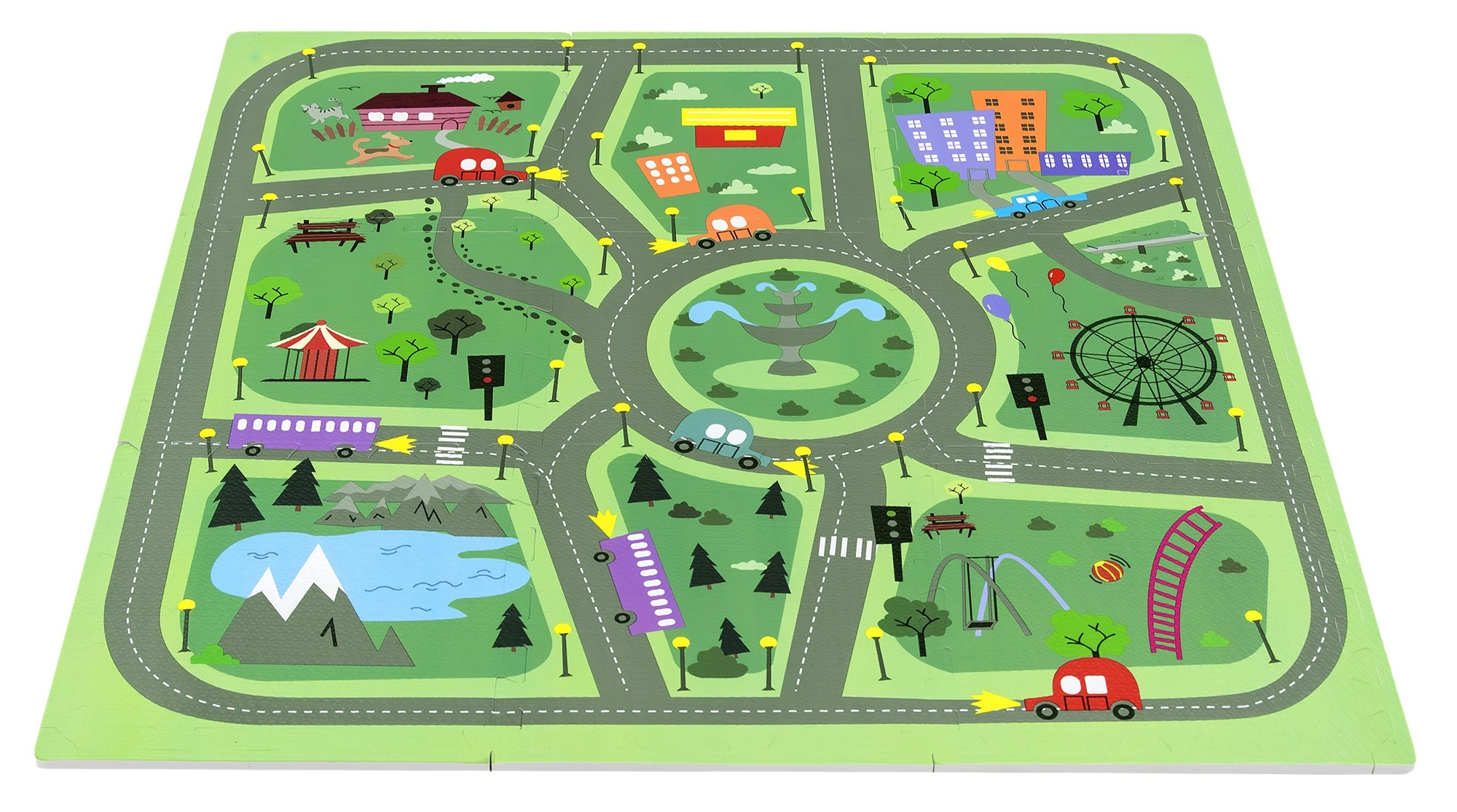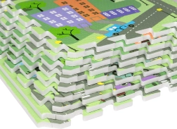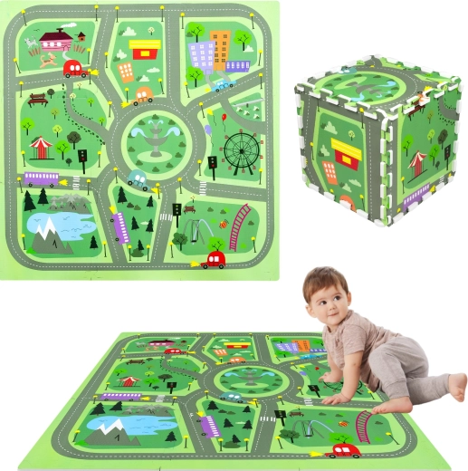 Създайте на детето удобно и хигиенично място за игра. Постелката от еластична EVA пяна е без фталати, формамид, PVC и BPA, има неплъзгаща се повърхност и фин релеф за по-сигурни първи стъпки. Пастелният мотив на градски улици с кръгово, паркове, езерце и сгради стимулира фантазията и приканва към каране на колички и творческа игра с фигурки.