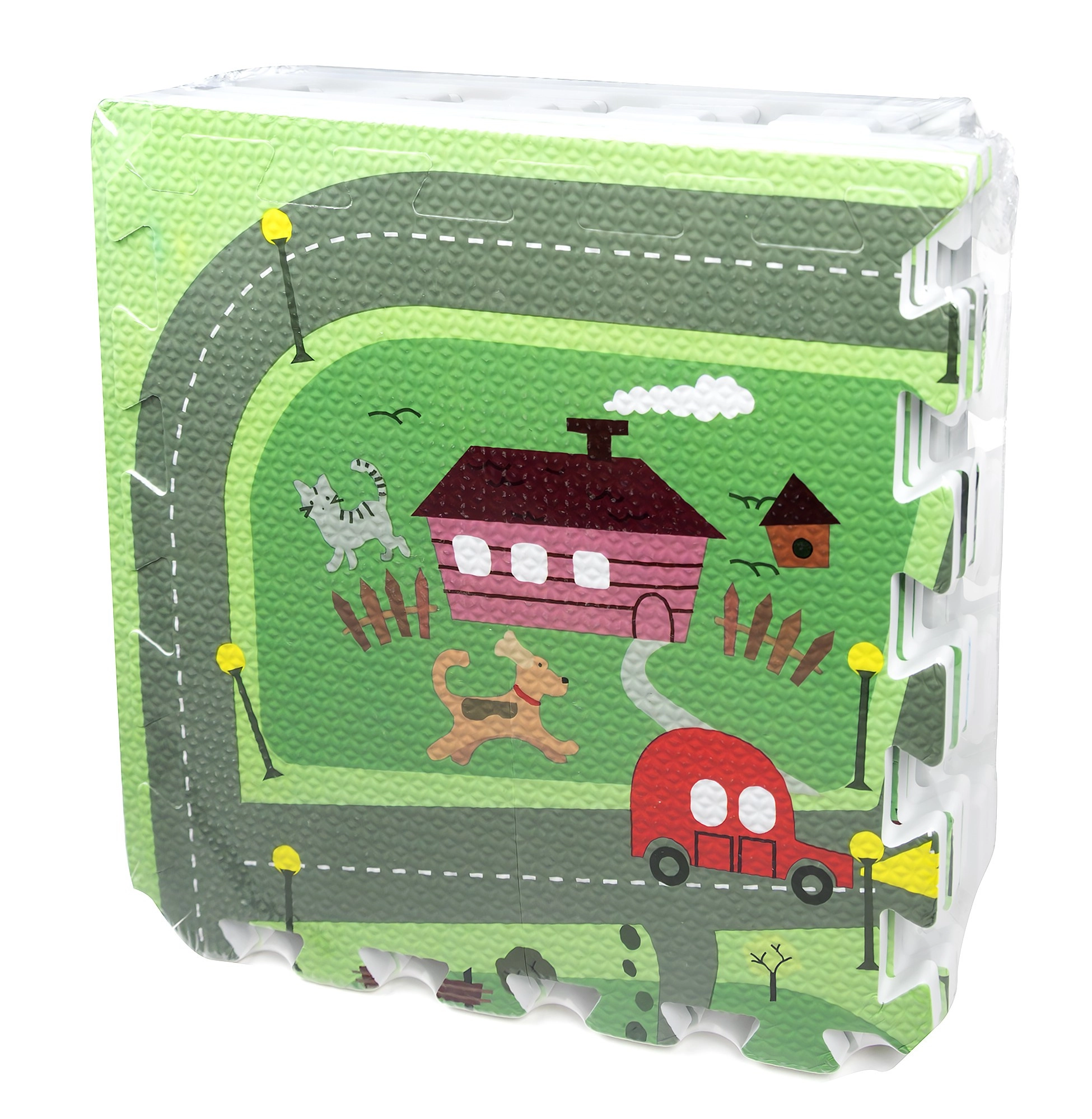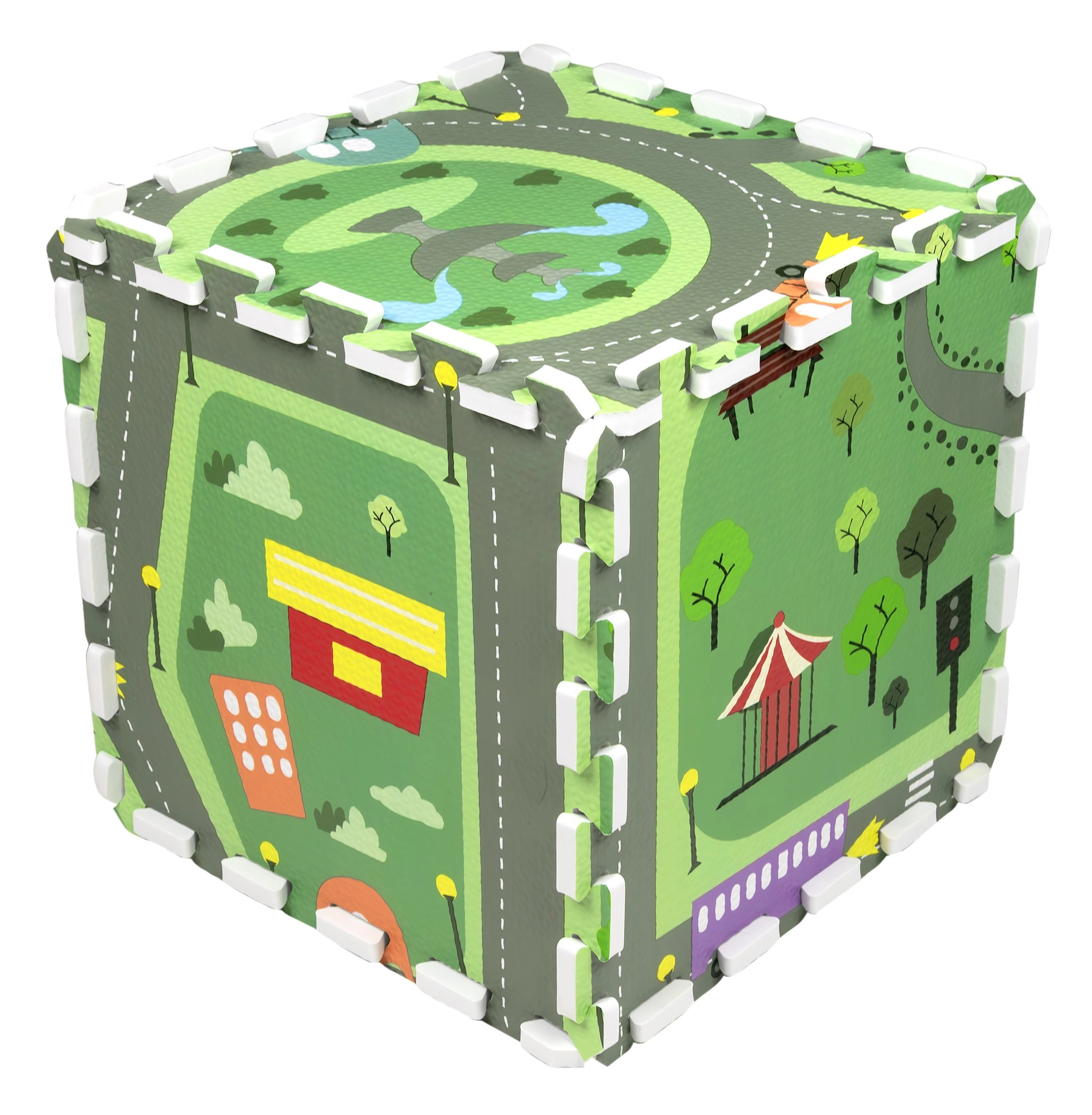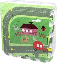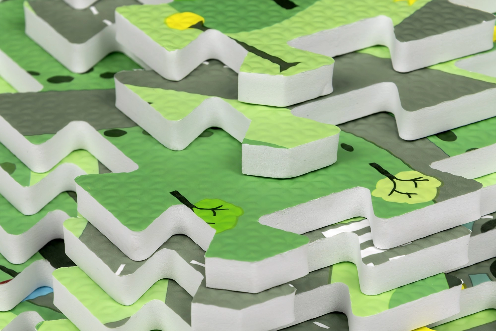 Създайте на детето удобно и хигиенично място за игра. Постелката от еластична EVA пяна е без фталати, формамид, PVC и BPA, има неплъзгаща се повърхност и фин релеф за по-сигурни първи стъпки. Пастелният мотив на градски улици с кръгово, паркове, езерце и сгради стимулира фантазията и приканва към каране на колички и творческа игра с фигурки.