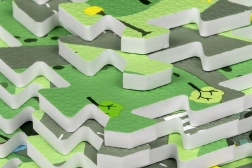 9 части с размер 30 × 30 × 1 см лесно се съединяват в площ 90 × 90 см, а крайните лайсни осигуряват чист завършек. Частите могат да се свързват в рамките на същия модел и да се строят 3D форми (напр. куб). Постелката отлично изолира студа от твърди подове (паркет, теракот, ламинат) и поглъща удари.