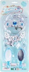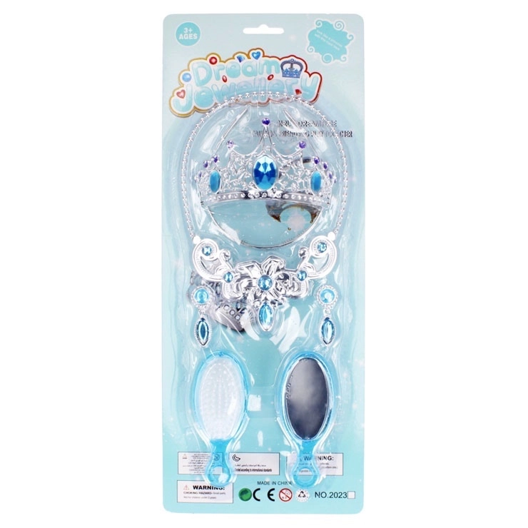Превърнете ежедневната игра в магичен бал с този комплект за малка принцеса. Включва сребриста диадема със сини и лилави камъчета, блестящо колие и обици, както и четка и ръчно огледалце за стилизиране. Лекият пластмасов дизайн е идеален за детски преобличания и насърчава креативността и въображението.