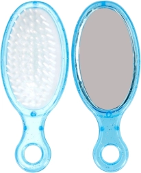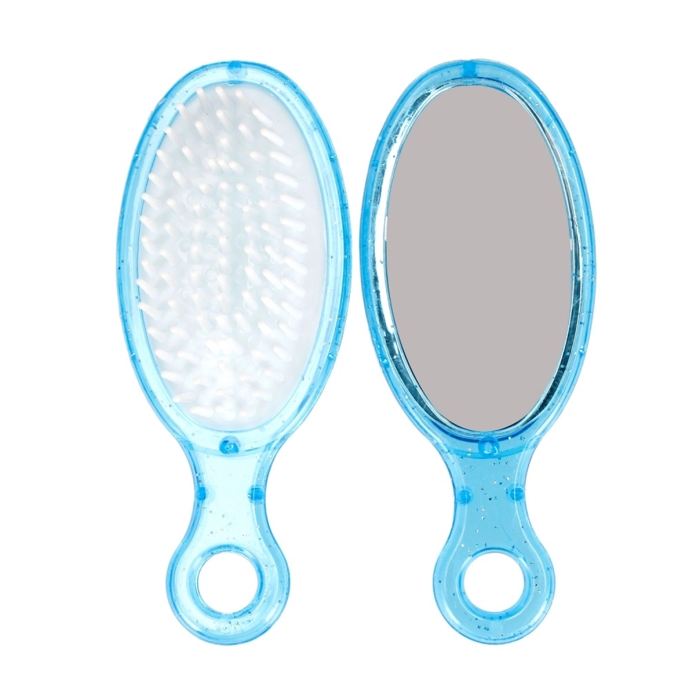 Лека синя четка и съответстващо ръчно огледалце позволяват на децата да сресват, оформят и проверяват прическите си, докато играят на салон за красота.