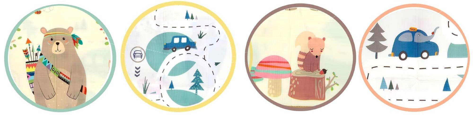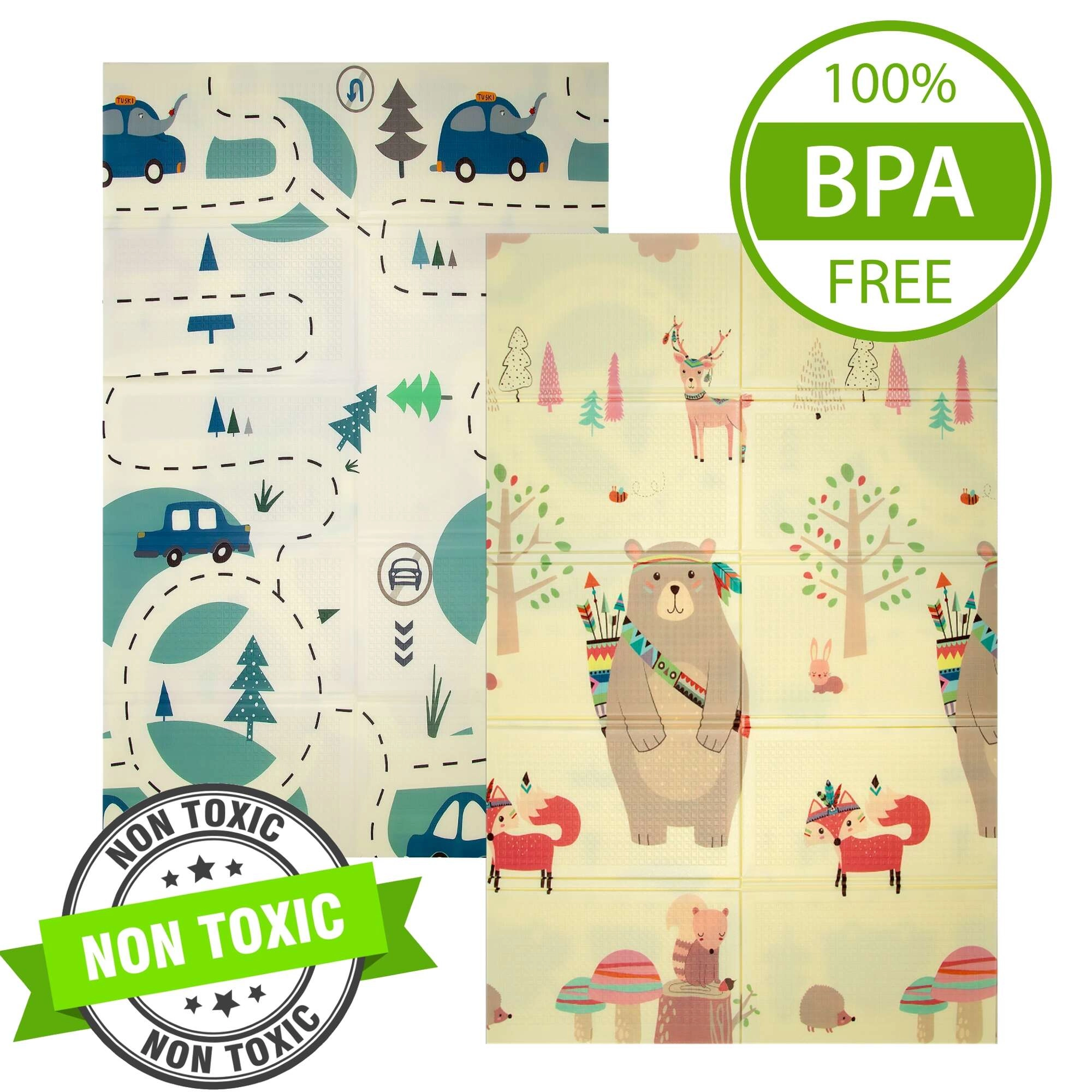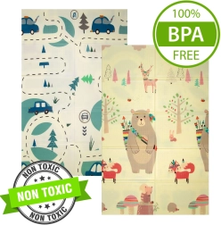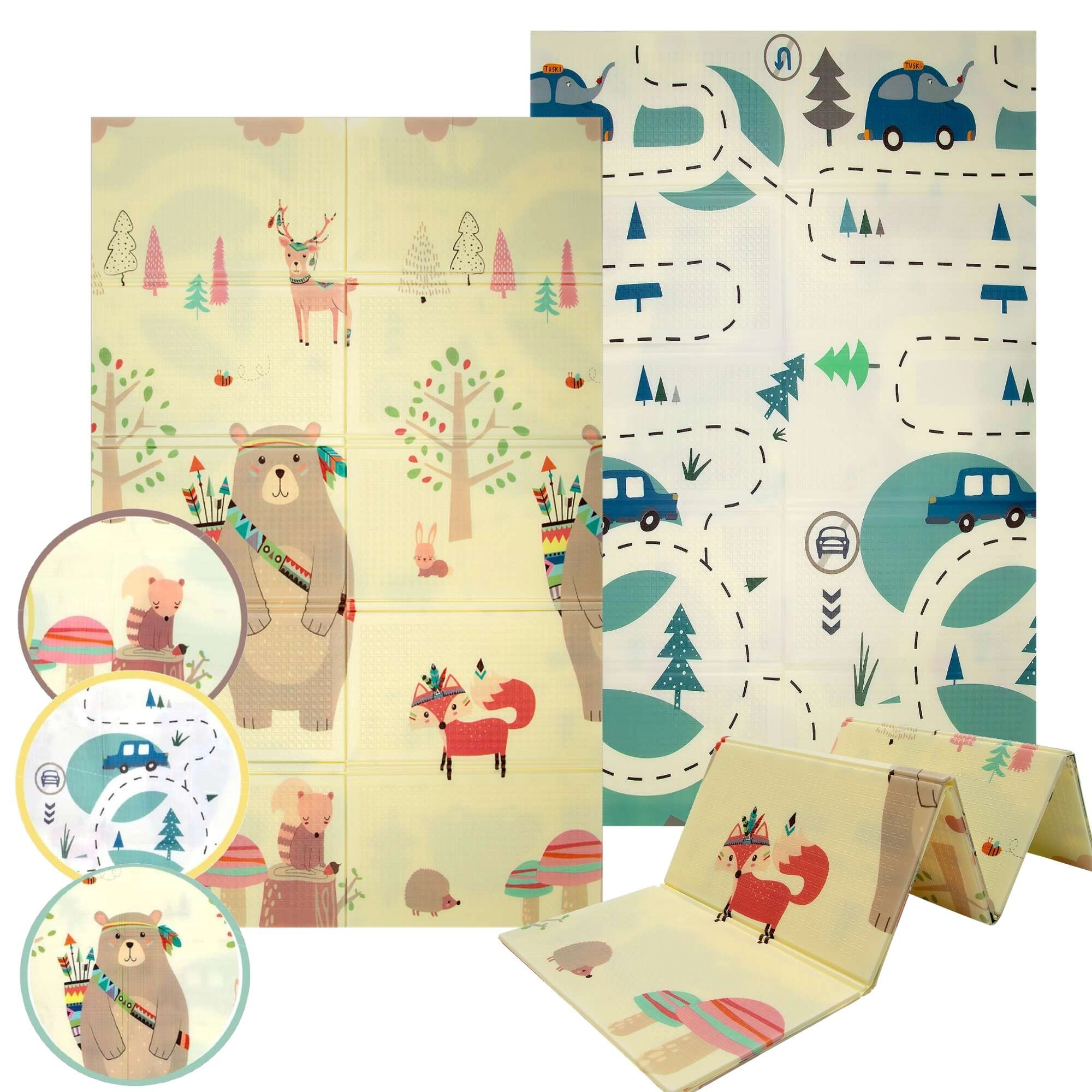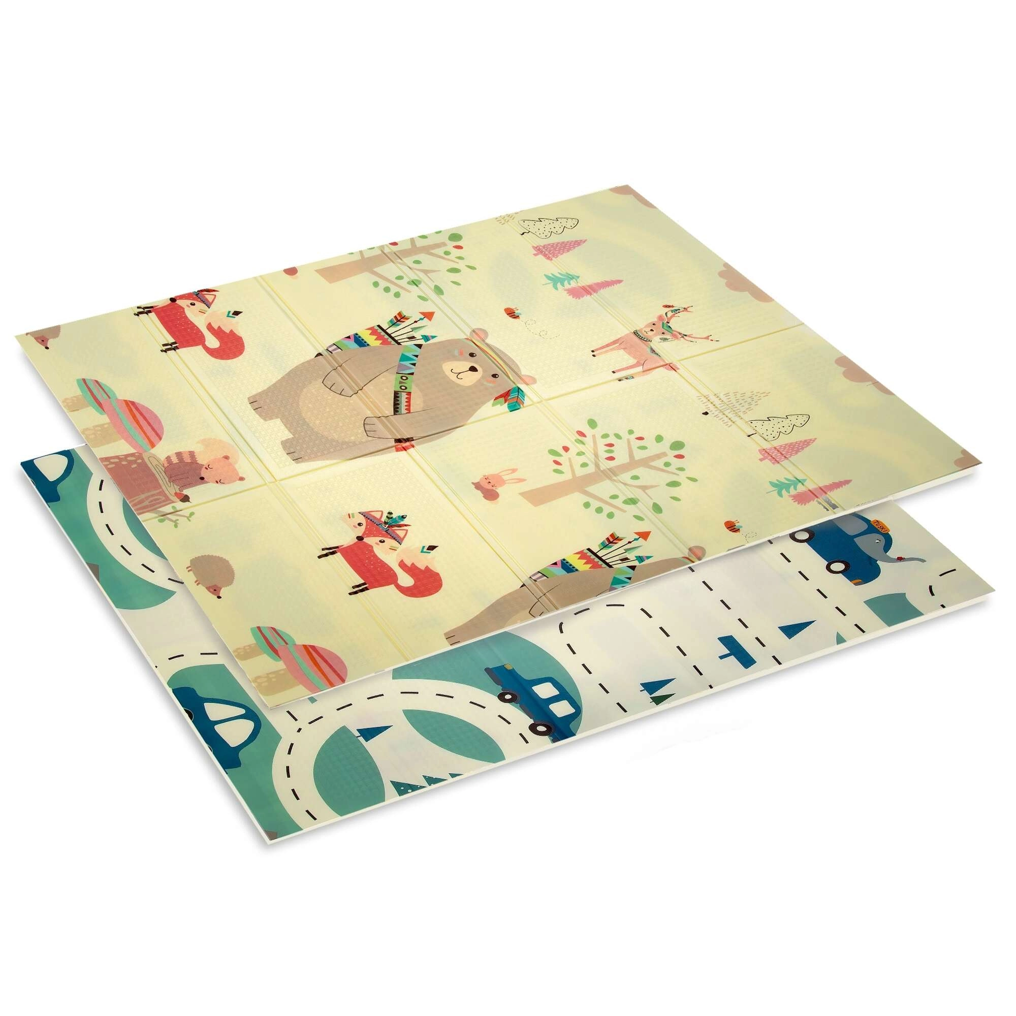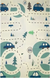 Едната страна с очарователни животни за детската стая, другата с път и коли за игри с колички. Лесно се съчетава с интериора и настроението на детето.