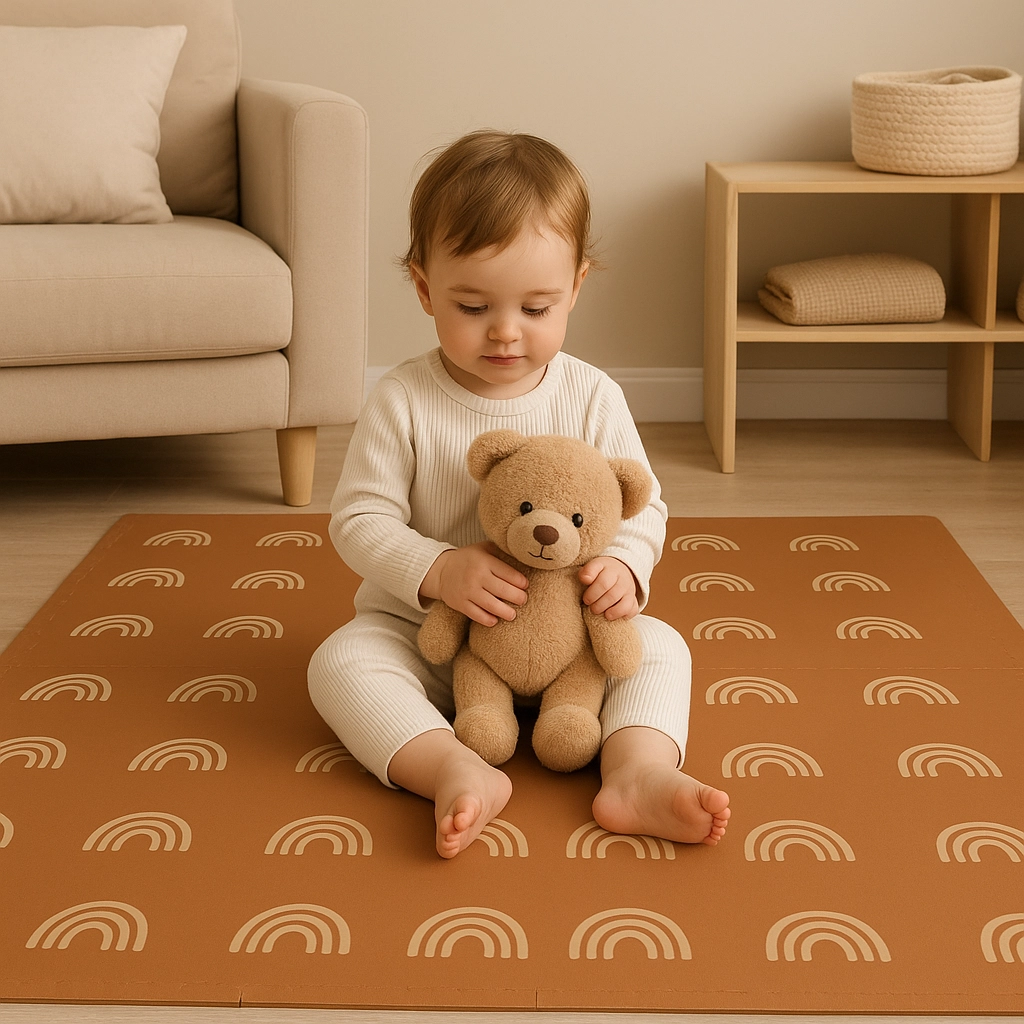 Дебелина 1 см от EVA пяна омекотява паданията и изолира студа, а противохлъзгащата повърхност подпомага безопасното пълзене и първите стъпки.